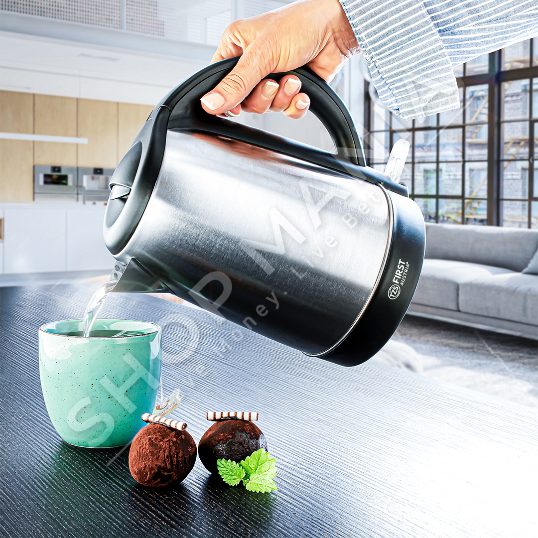 Ibriku elektrik "First Austria FA-5409-7 Steel kettle 2200 watt | automatic switch-off" eshte pajisja ideale per ta nisur diten me nje filxhan te ngrohte caji ose kafeje.