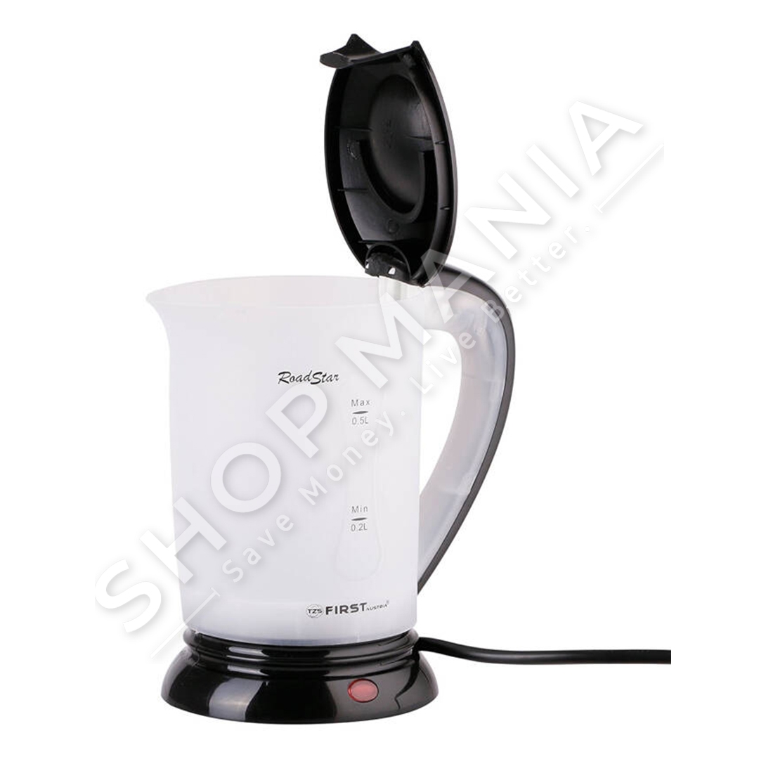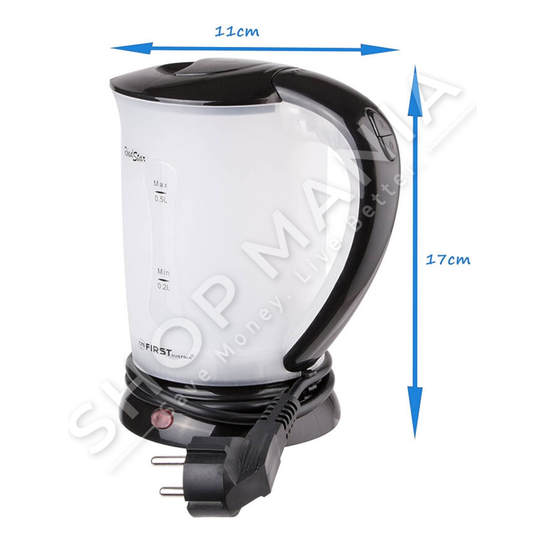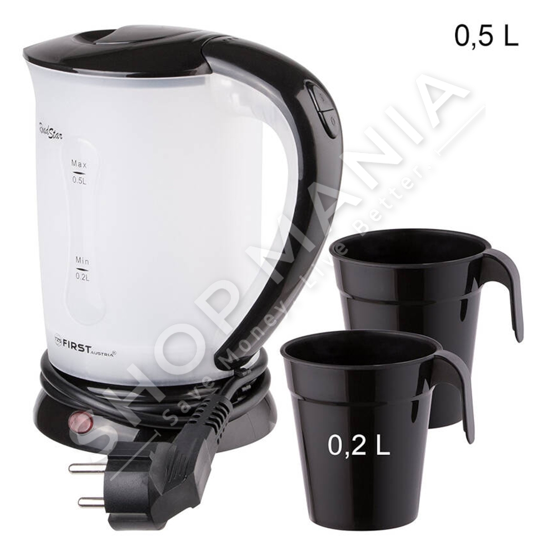 Ibriku elektrik "First Austria FA-5425-2-BA Travel water kettle 0.5 L 700 W" eshte pajisja ideale per ta nisur diten me nje filxhan te ngrohte caji ose kafeje.