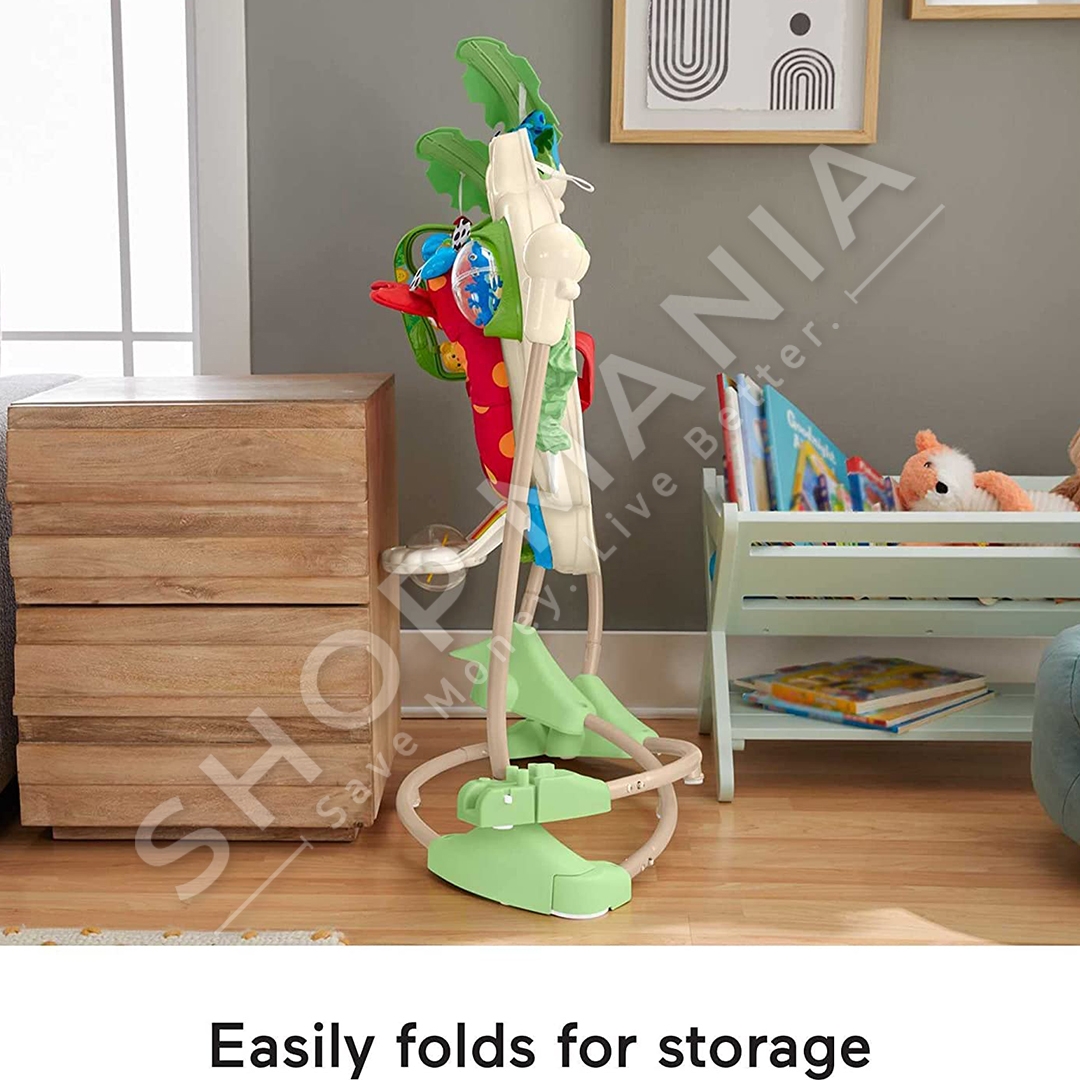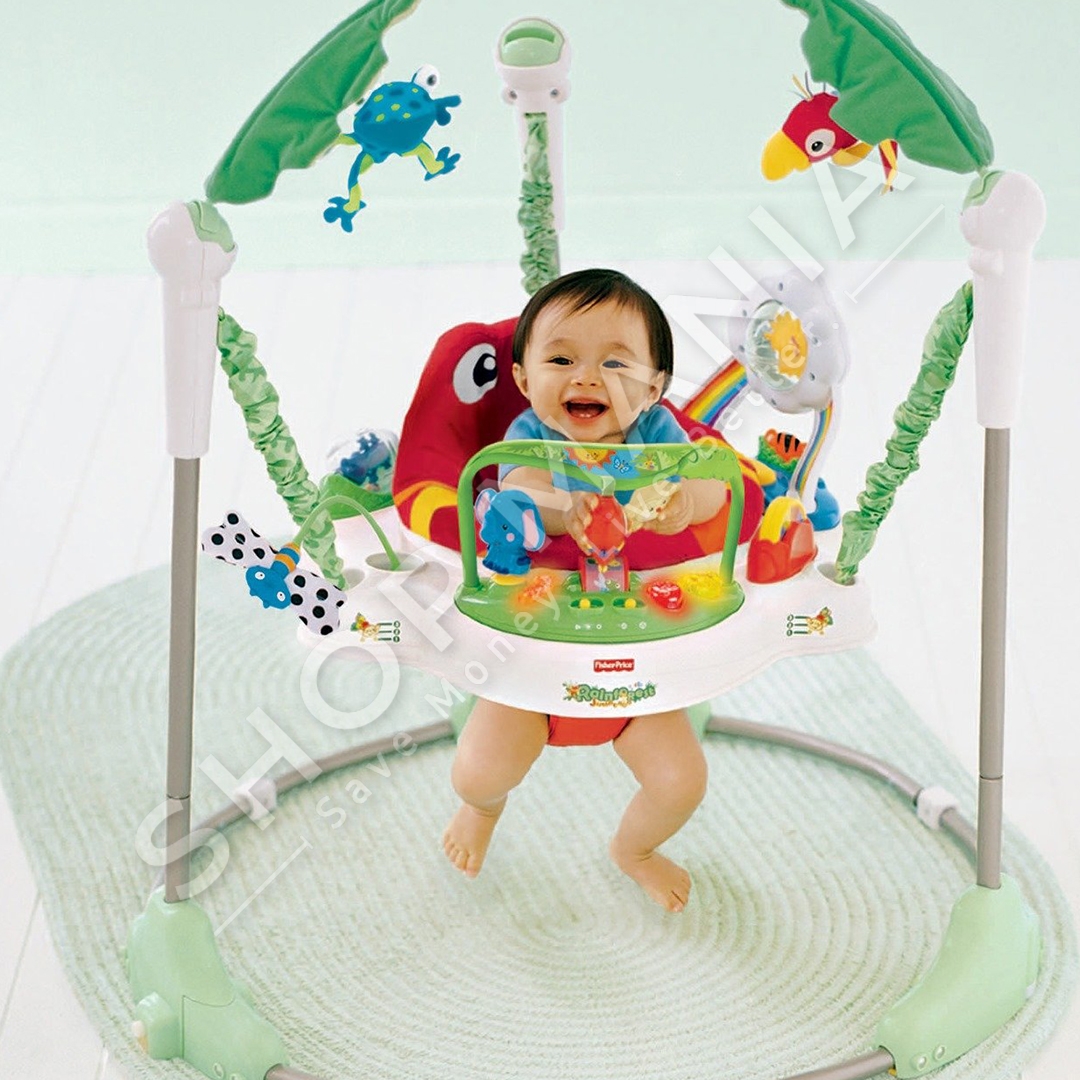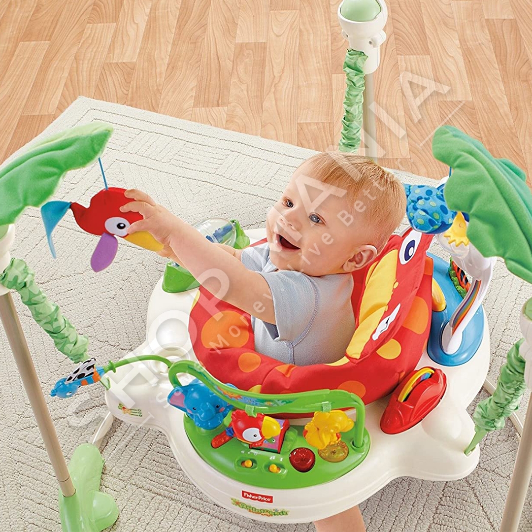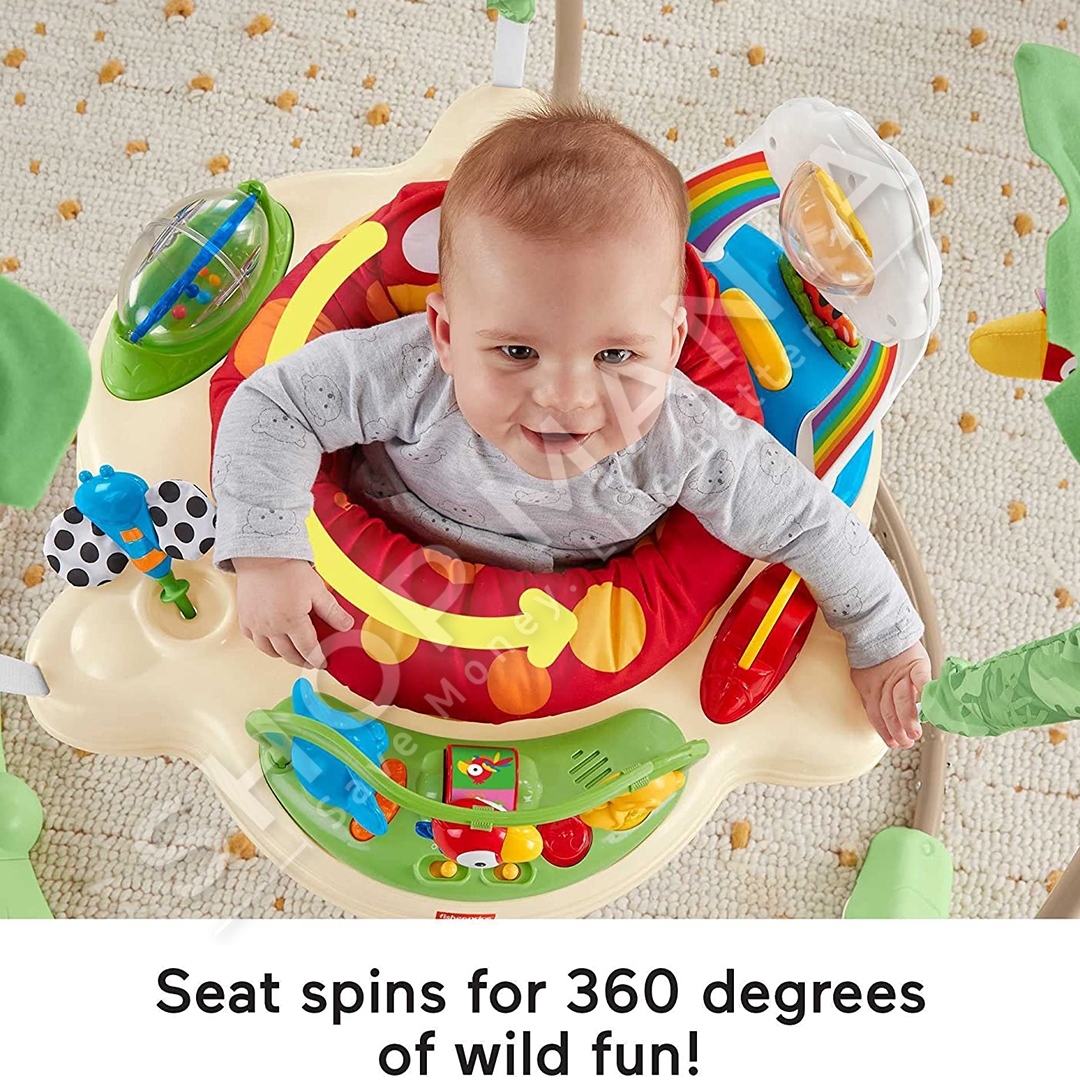 "Fisher-Price® Rainforest™ Jumperoo™" ofron argetim maksimal per te vegjlit tuaj nepermjet muzikes dhe dritave.