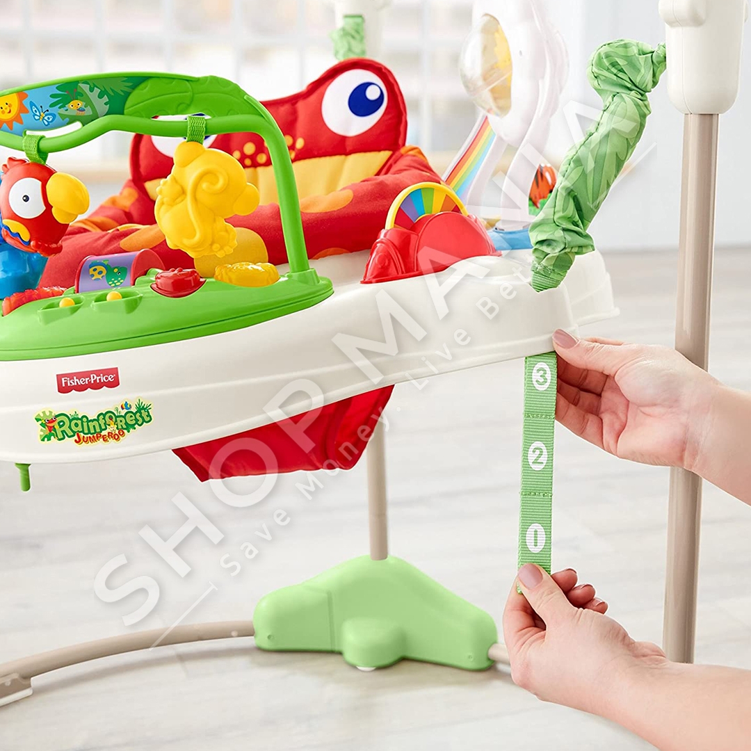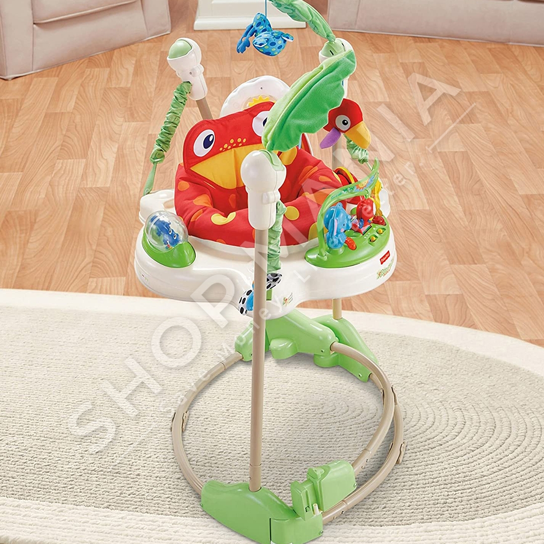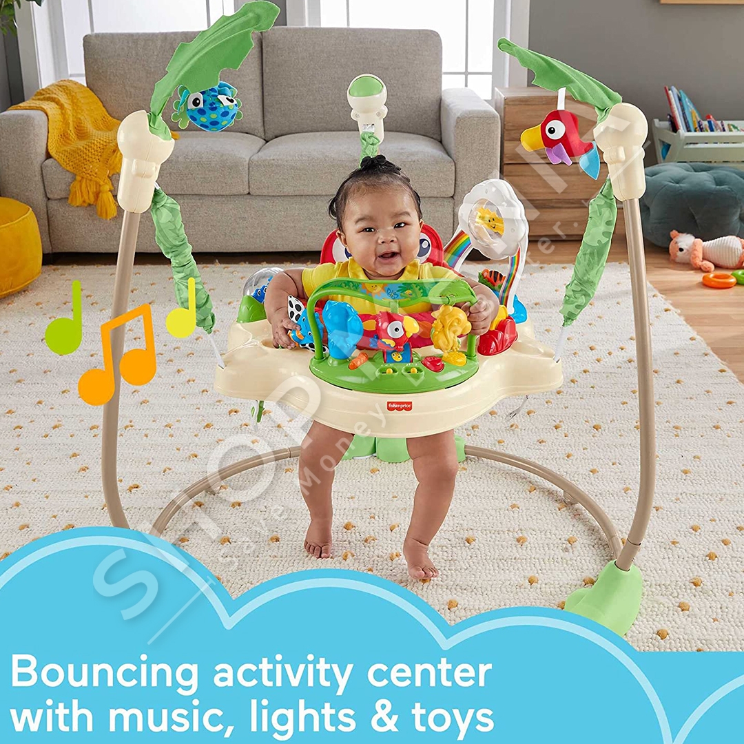 "Fisher-Price® Rainforest™ Jumperoo™" ofron argetim maksimal per te vegjlit tuaj nepermjet muzikes dhe dritave.