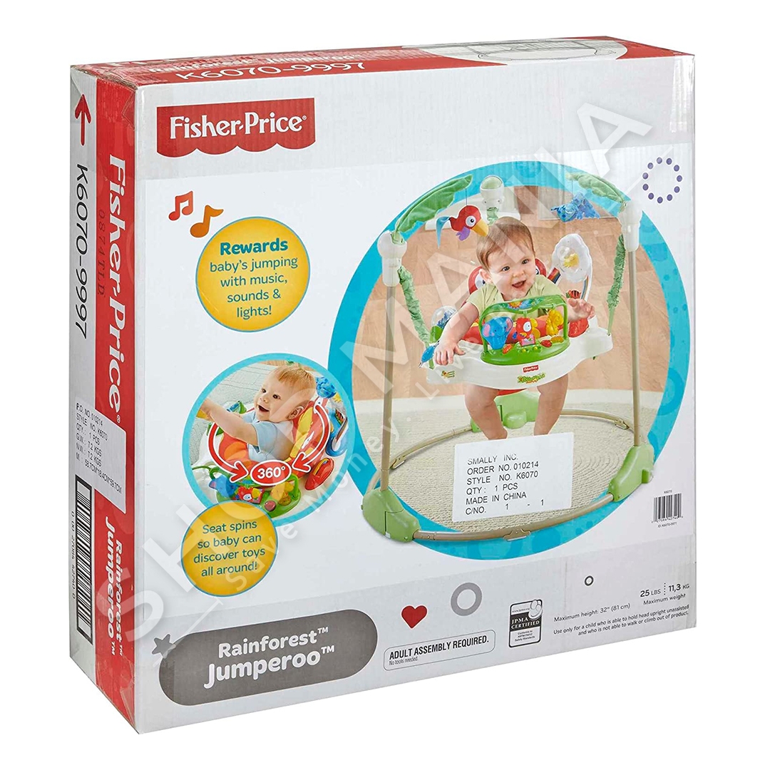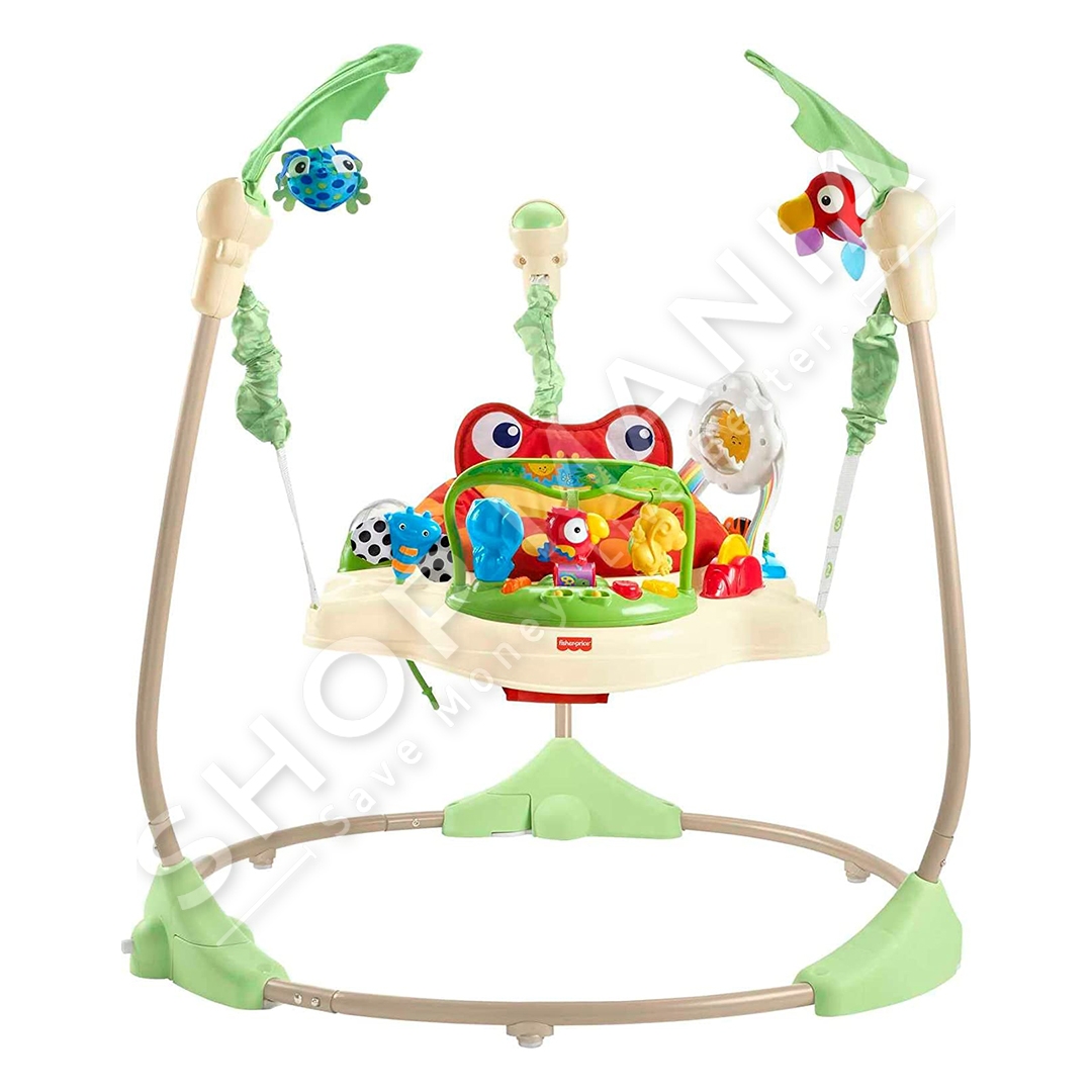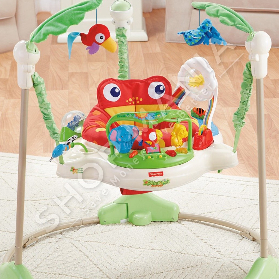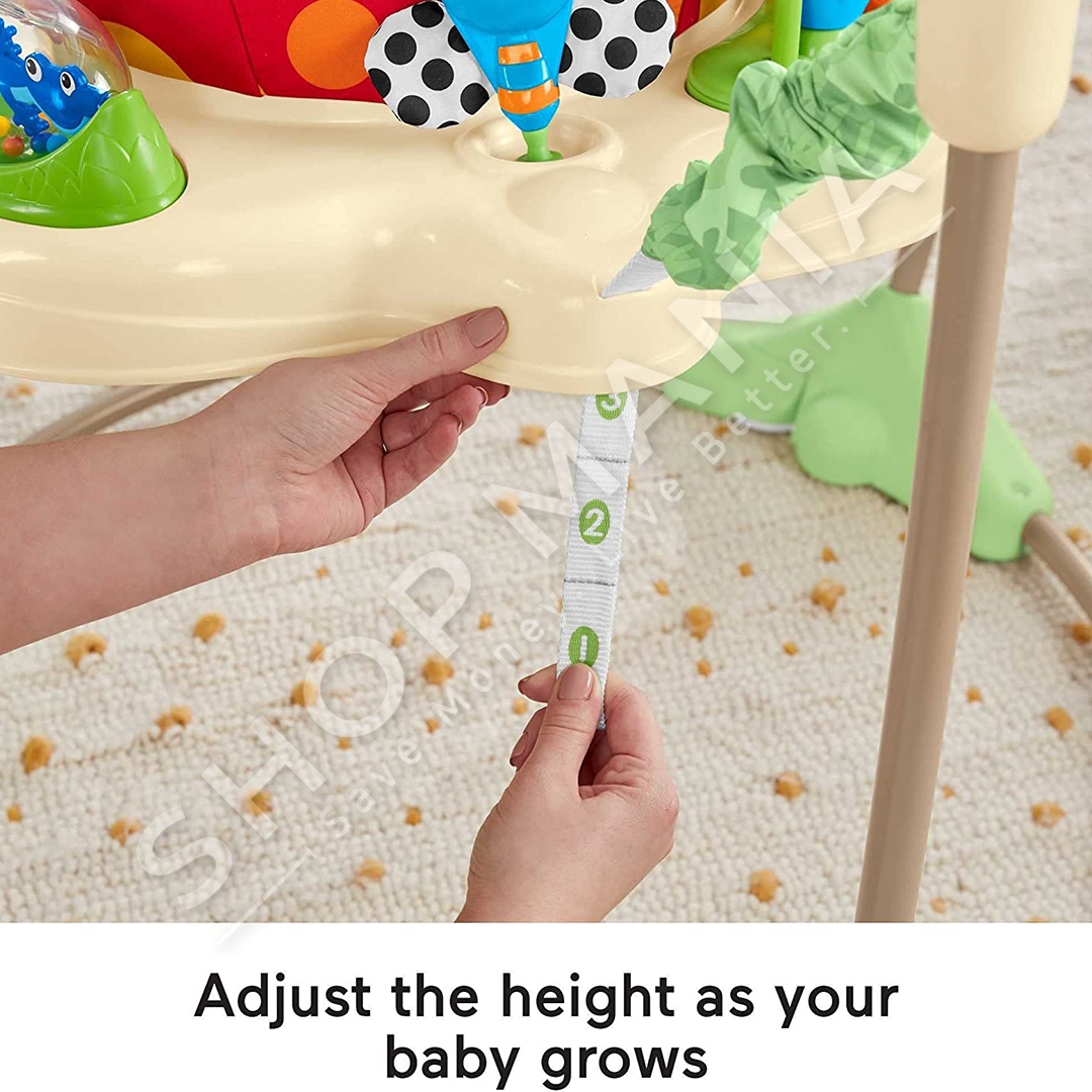 "Fisher-Price® Rainforest™ Jumperoo™" ofron argetim maksimal per te vegjlit tuaj nepermjet muzikes dhe dritave.