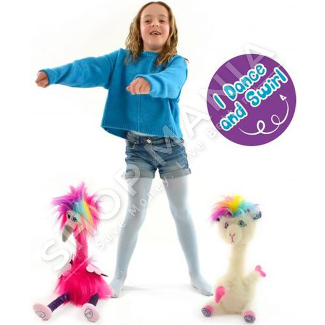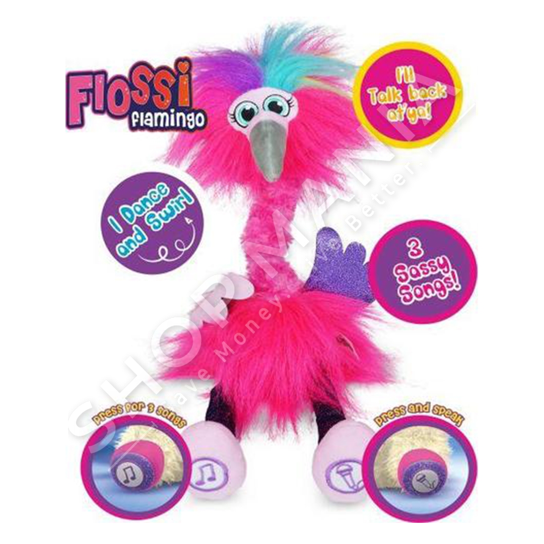 Eshte koha per te kercyer me flamingon Flossi prej pellushi. Flossi ka dy menyra argetimi: flet ose kercen. Thjesht shtypni mikrofonin ne kemben e Flossit per te biseduar. Flossi regjistron zerin tuaj dhe me pas perserit ate qe ju thoni me ze te ashper dhe argetues per femijet. Kur shtypni noten muzikore ne kemben tjeter te Flossit, vijne tre kenge qe i bejne te gjithe te kercejne bashke me te. Qafa e Flossit kercen gjithashtu, duke u tundur dhe femijet argetohen shume me te.