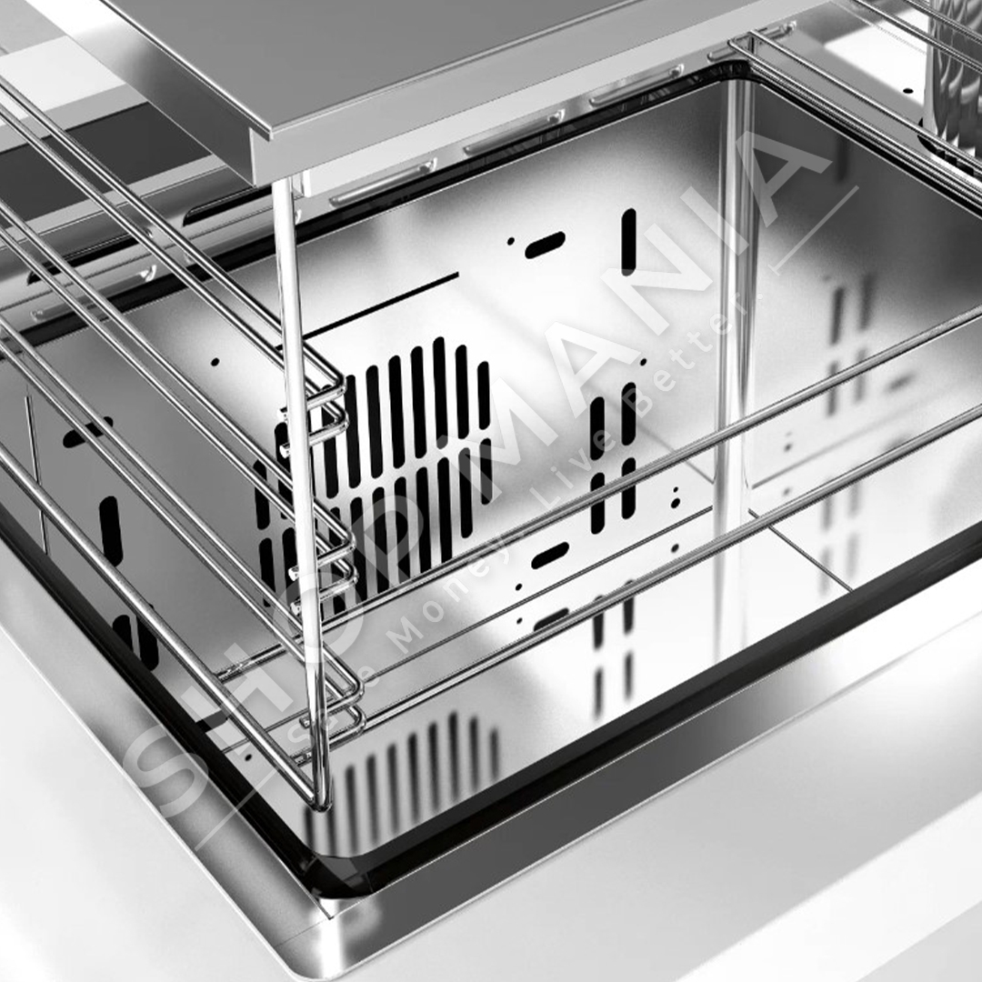Mbeshtetja e zgjatur e furres eshte e pajisur me 3 nivele lartesie, ne te cilat ruhen pllaka pjekjeje prej xhami sigurie ne forme pjatash te ceketa.