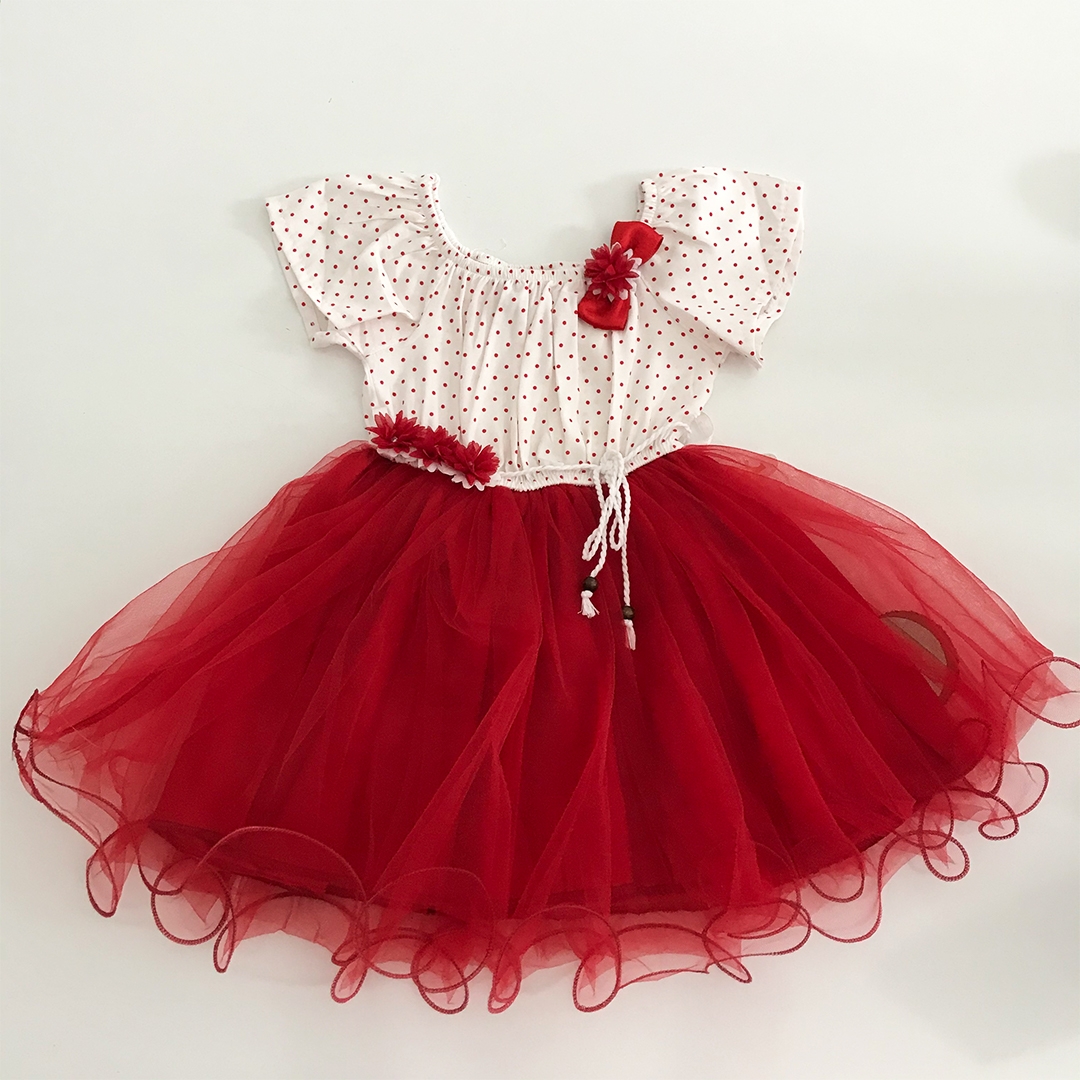 Fustan me tyl, lule te pjesa e belit dhe bustit, me pika dhe jake te hapur