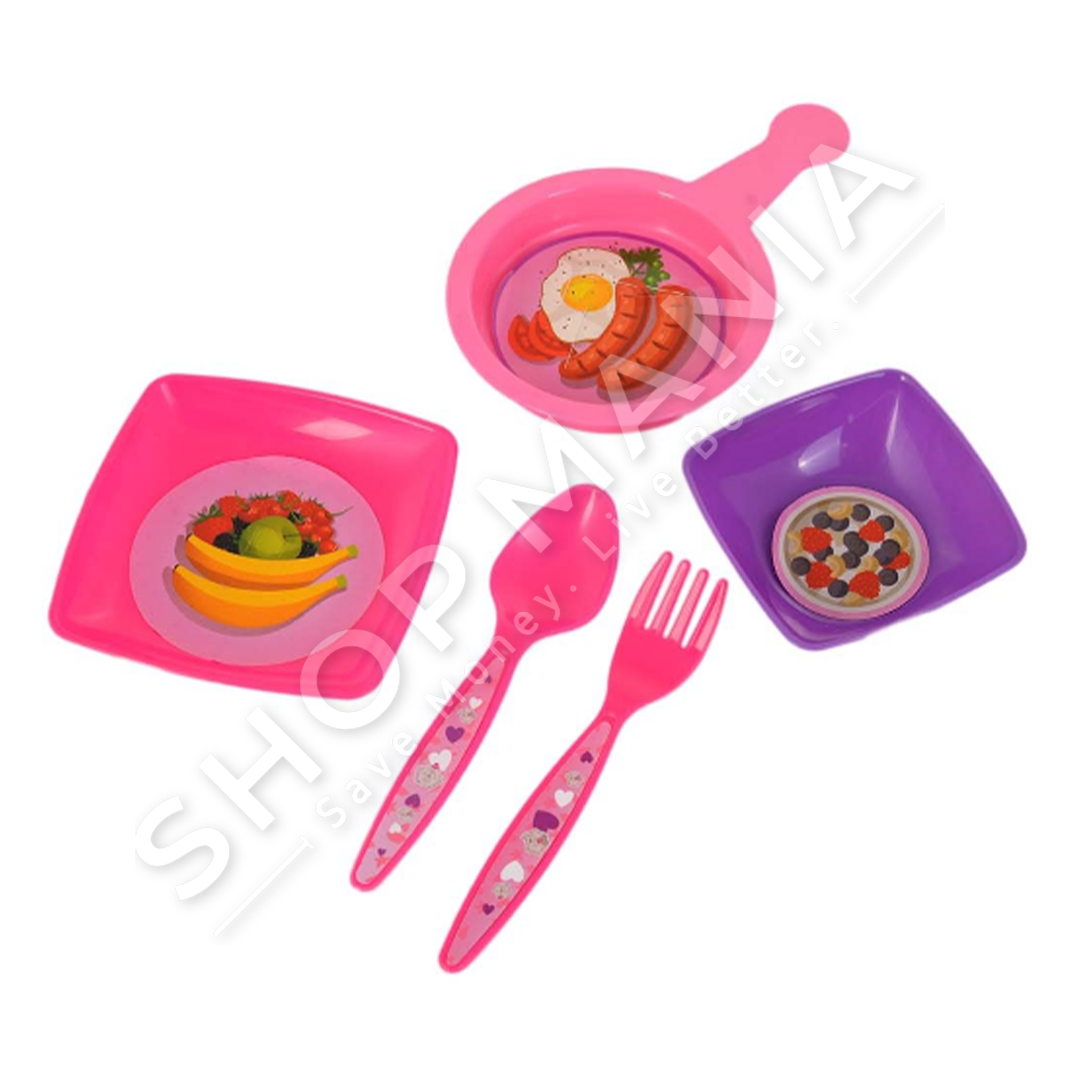 Ne paketim perfshihet kukulla se bashku me aksesore kuzhine si: 2 pjata, tigan, luge dhe pirun.