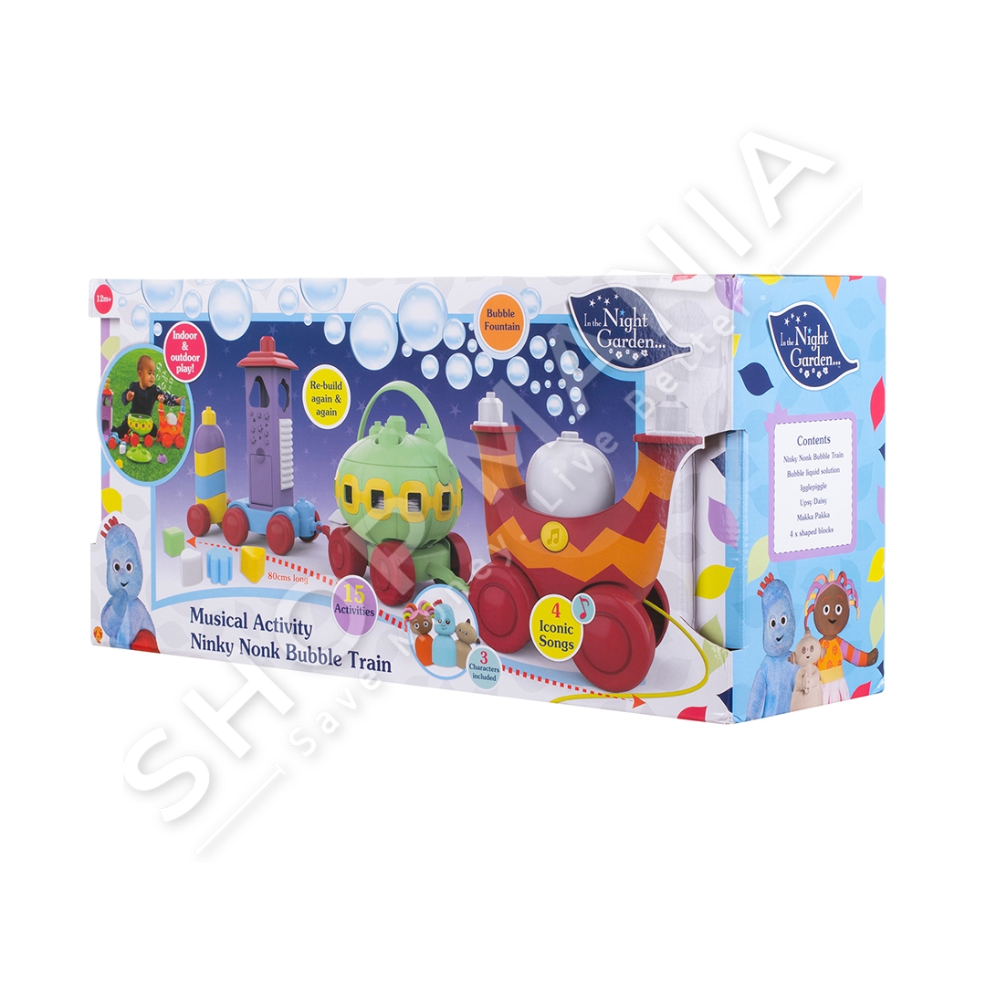 ITNG Garden Musical Activity Ninky Nonk Bubble Train eshte loje interesante per femijet mbi 1 vjec. Me 5 karroca shumengjyreshe qe lidhen se bashku per te krijuar nje terheqje pergjate trenit. Loja ka 3 melodi te ndryshme. Shtypni butonin yll per te pasur nje drite qetesuese gjate nates dhe per te degjuar ninullen qetesuese te gjumit. Shtypni dritaren lart per te zbuluar Igglepiggle dhe me pas shtyjeni ate poshte per ta degjuar si kendon. Mosha: +1 vjec