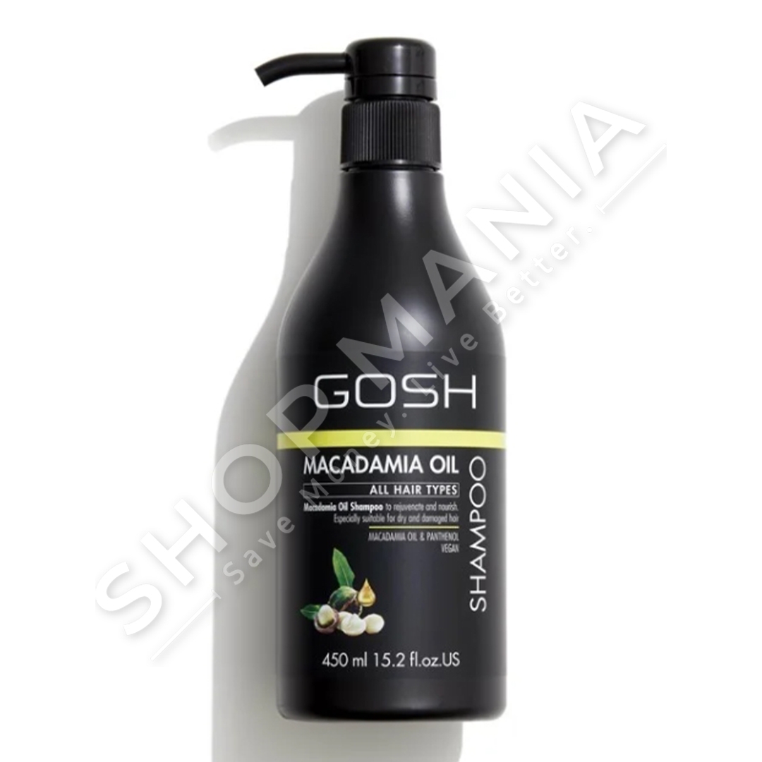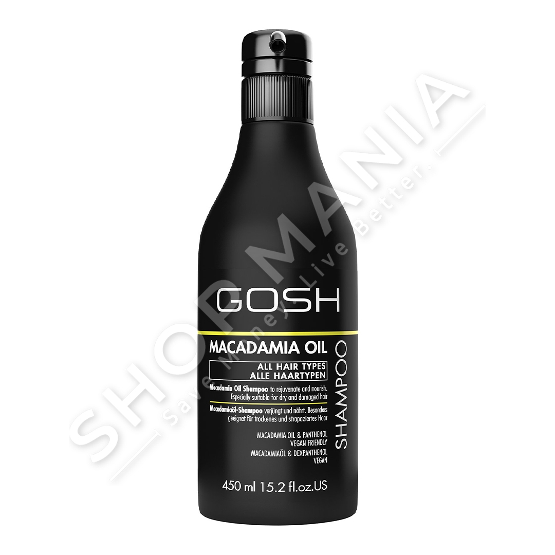 Shampo per floket Gosh Macadamia Oil mund te perdoret per te gjitha llojet e flokeve, por eshte vecanerisht e mire per floket e thate, kacurrele ose te demtuar. Ajo permban nje kombinim te vajit te makadamias, Panthenolit dhe Vitamines Pro B5, e cila eshte rinovuese, ushqyese dhe hidratuese si ne floke ashtu dhe per skalpin e kokes. Shampoja eshte e pershtatshme per perdorim te perditshem dhe do te jape shkelqim flokut tuaj.
