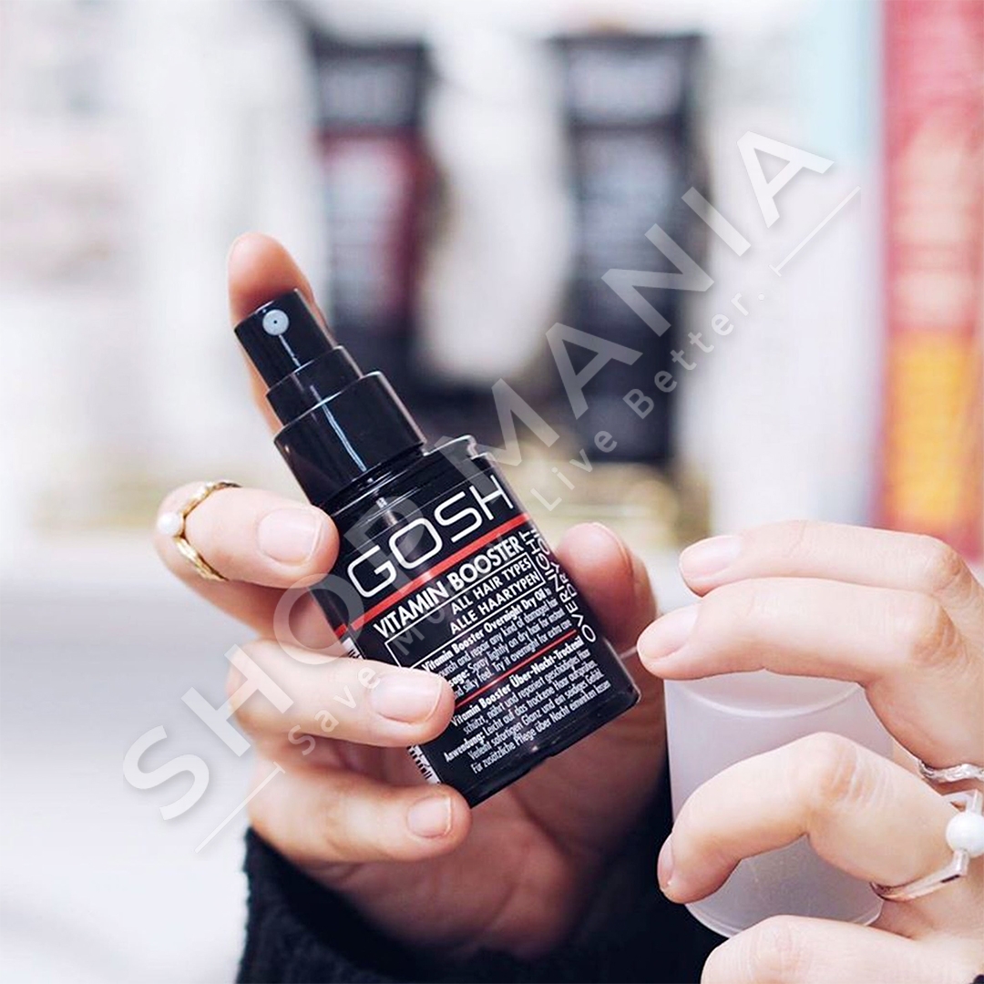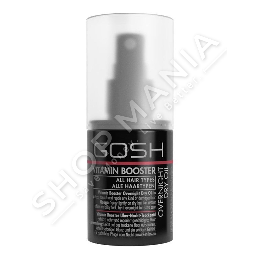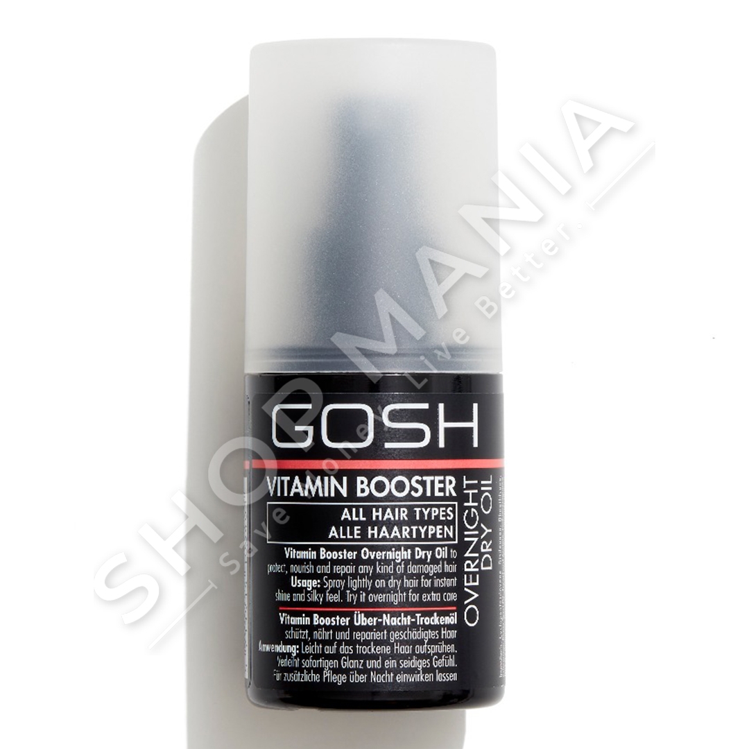 Vaj i thate gjate nates Gosh Vitamin Booster eshte nje vaj qe siguron kujdes intensiv per floket. Ky vaj i lehte mund te beje mrekulli - jo vetem per floke shume te thate, por eshte gjithashtu i pershtatshem per floke te demtuar me maja te ndara. Mund te perdoret gjate dites per t'i dhene shkelqim flokeve, por mund te sperkatet ne floke dhe gjate nates. Permban nje perzierje te vitaminave B, D dhe E dhe korrigjon majat e ndara, ushqen dhe zbukuron floket.