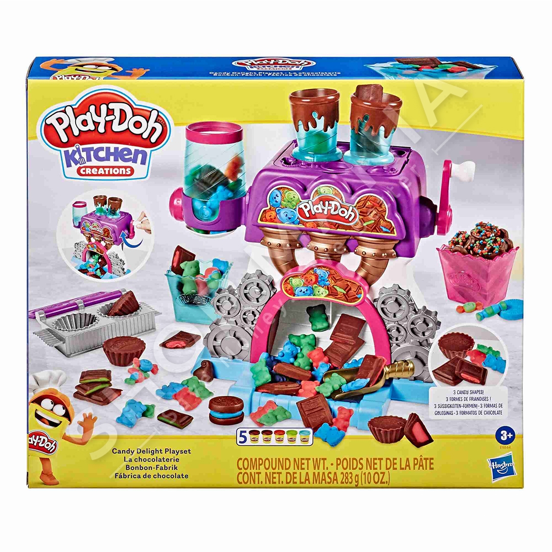 Nje bollek me embelsira dhe karamele ne fabriken e embelsirave PlayDoh Kitchen Creations Candy Delight Playset.