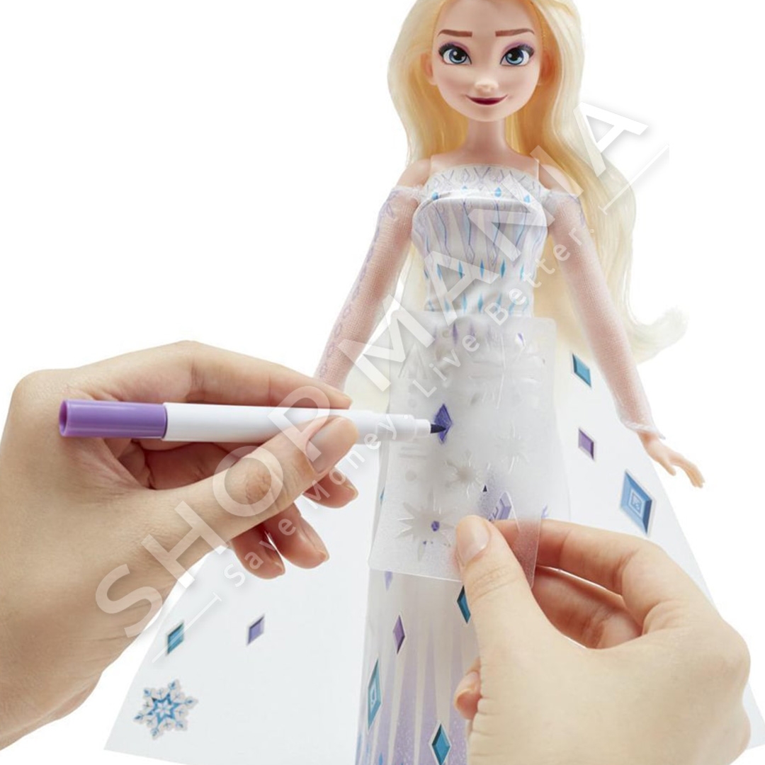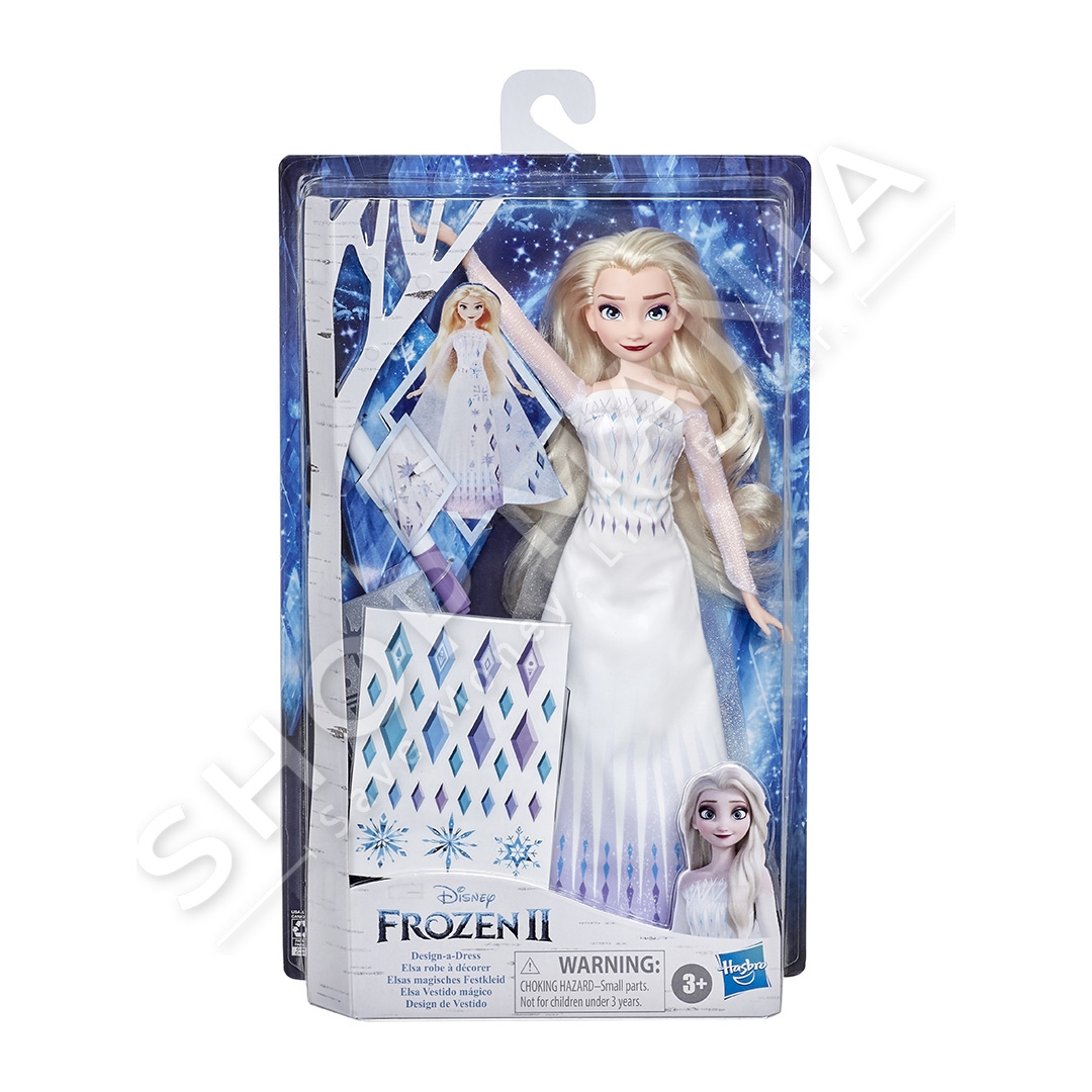 Kukulla Elsa nga Disney Frozen II Design-A-Dress, eshte princesha e debores. Me nje fustan magjepses ngjyre te bardhe me detajet e diamantit dhe debores. Me floke te gjate ngjyre te verdhe eshte e bukur si gjithmone. Mosha: +3 vjec