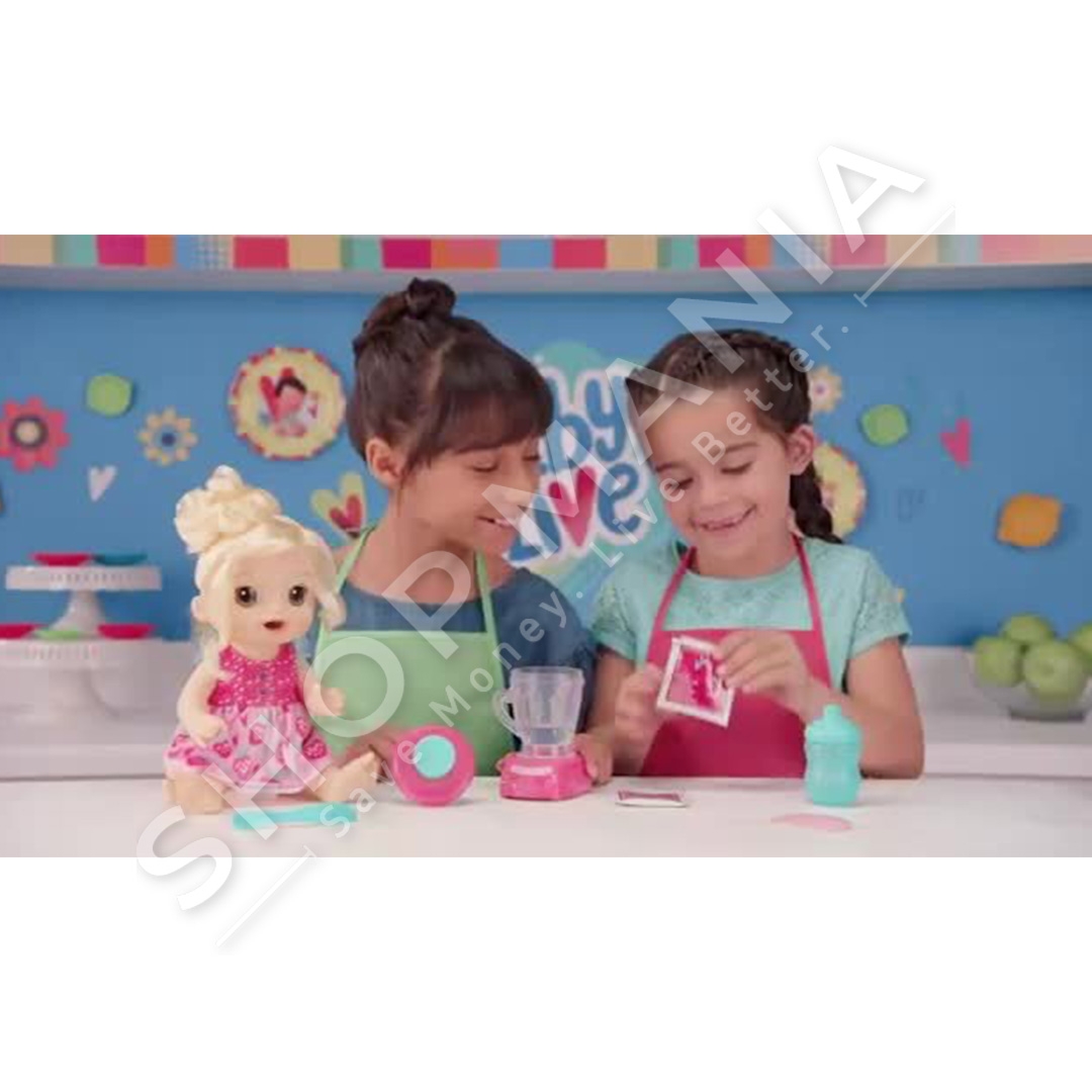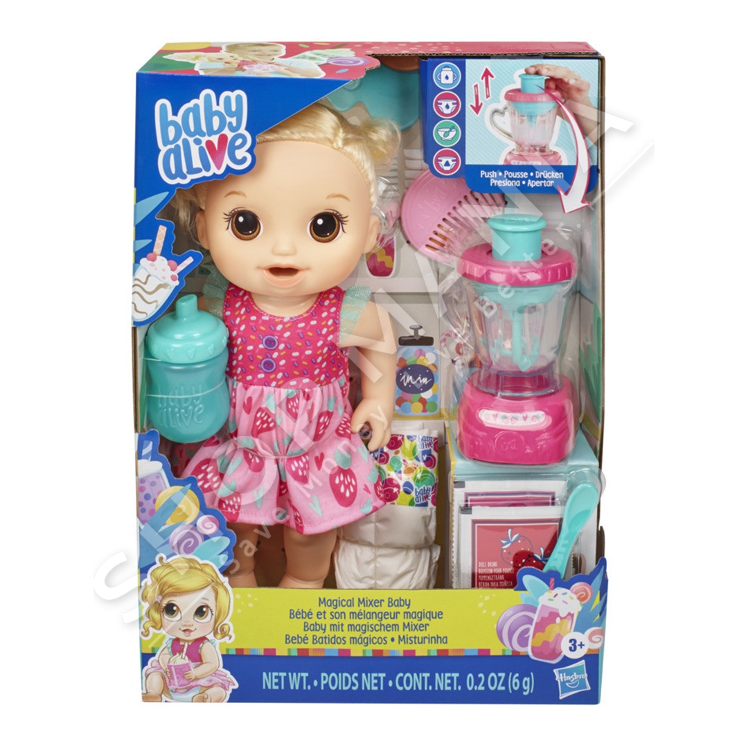Kukulla Baby Alive Magical Mixer Baby Strawberry vjen se bashku me nje blender per te pergatitur ushqimin e saj. Thjesht mund te hapni 1 nga 2 paketat e ushqimit pluhur dhe ta hidhni ne blender. Mjafton te shtypni butonin per te perzier ushqimin e kukulles dhe ta ushqeni ate. Per femije mbi 3 vjec. Mosha: +3 vjec