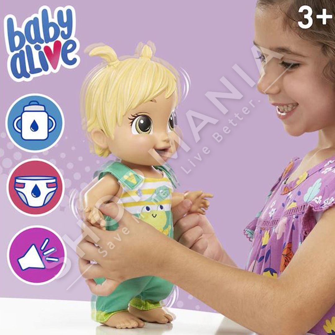 Kukulla Baby Alive eshte loder teper argetuese per te vegjlit tuaj. Kur i mban duart e saj dhe i shtrengon kycin, kukulla kercen lart e poshte si bretkoce dhe shperthen ne te qeshura. Ne paketim ka dhe biberonin e saj dhe nje pale pelena per ta nderruar. Per femijet mbi 3 vjec. Mosha: +3 vjec