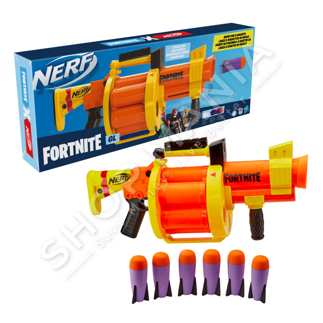 Pistoleta Nerf Fortnite GL eshte frymezuar ajo e perdorur ne Fortnite, duke kopjuar pamjen e asaj nga videoloja popullore.