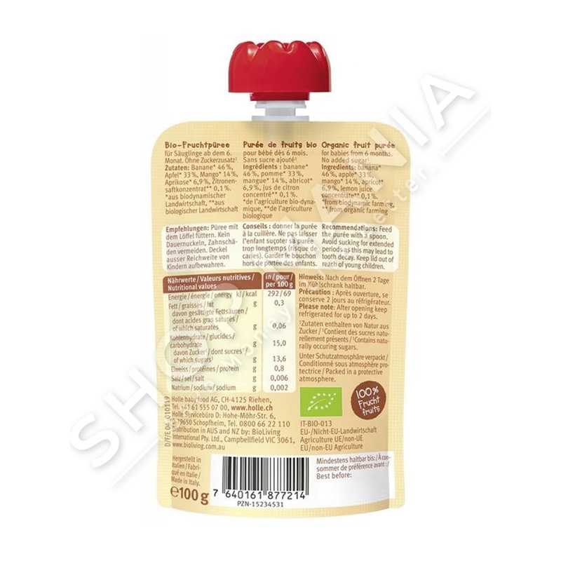 Përbërësit: Banane 46%, molle 33%, mango 14%, kajsi 6,9%, leng limoni i perqendruar 0,1%