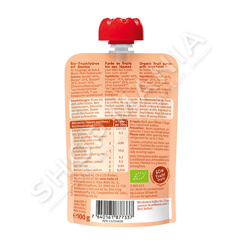 Përbërësit: Karote 40% **nga ferma biodinamike, mango 20% **nga ferma biodinamike, banane 20% **nga ferma biodinamike, dardha 20% **nga ferma biodinamike, leng limoni i perqendruar *nga ferme organike.