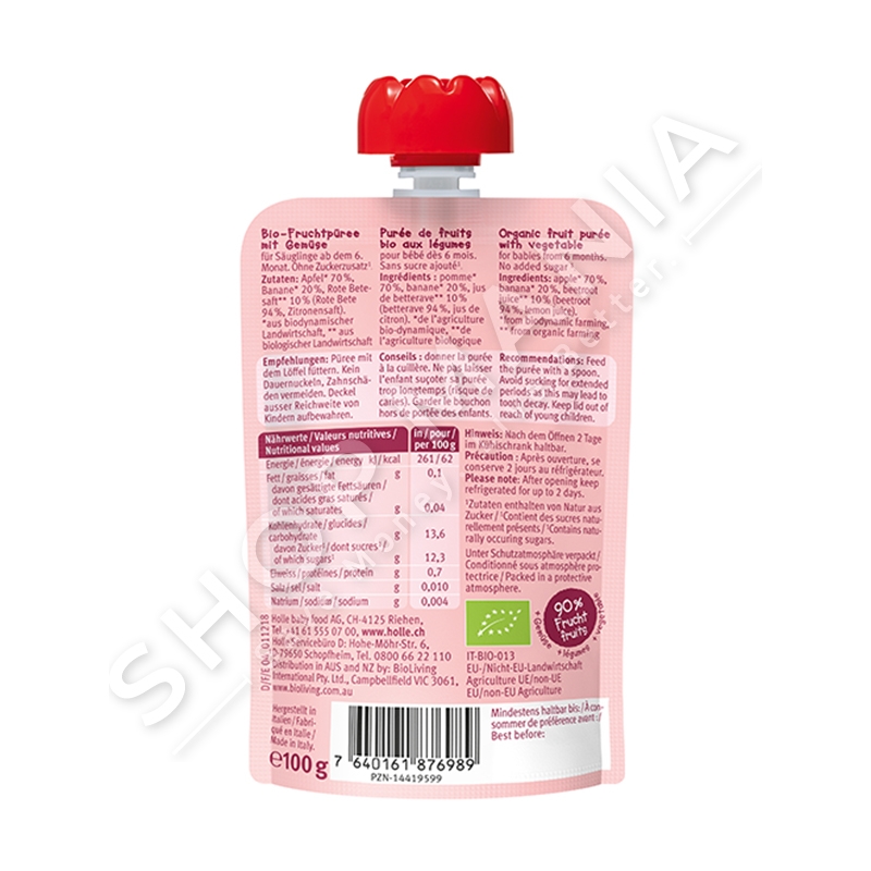 Përbërësit: Molle 70% *nga ferma organike, banane 20% *nga ferma organike, leng panxhari te kuq 10% ** nga ferma biodinamike ( panxhar i kuq 94%, leng limoni).