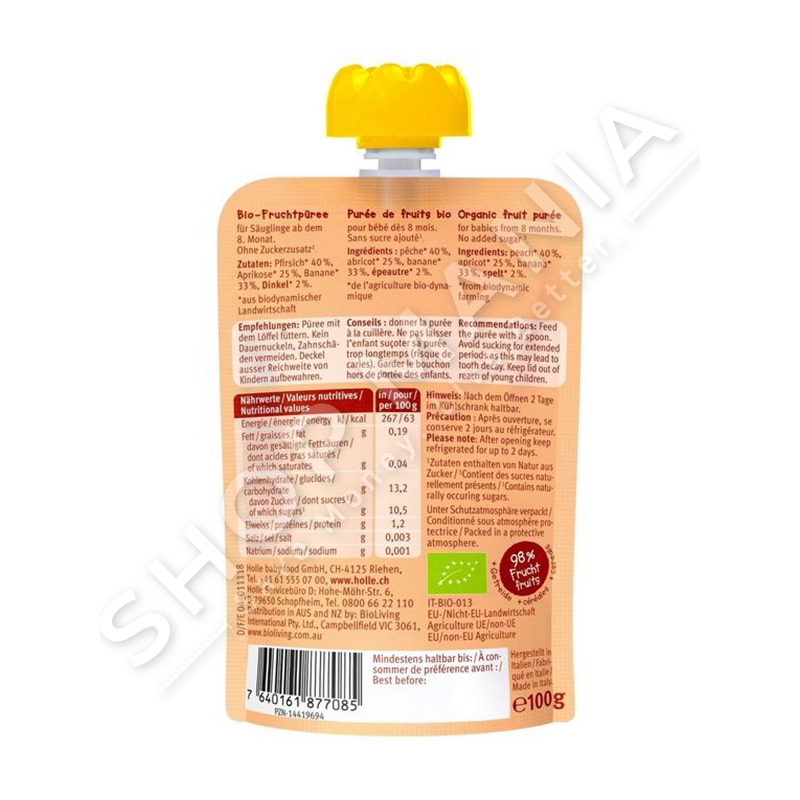 Përbërësit: Pjeshke 40% **Demeter, banane 33% ** Demeter, kajsi 25% ** Demeter, Spelt 2% **Demeter