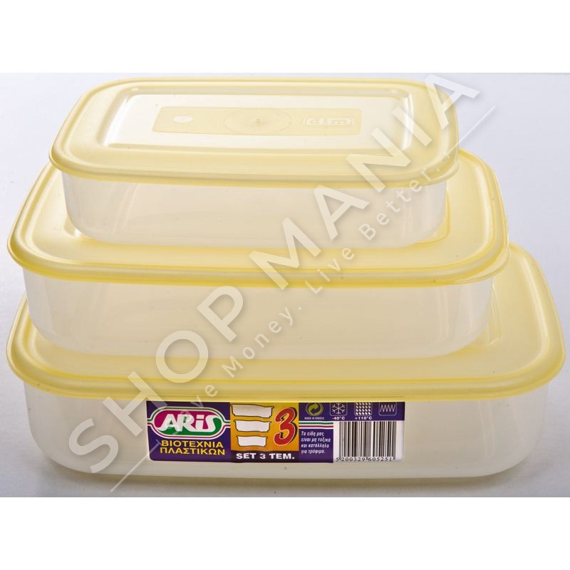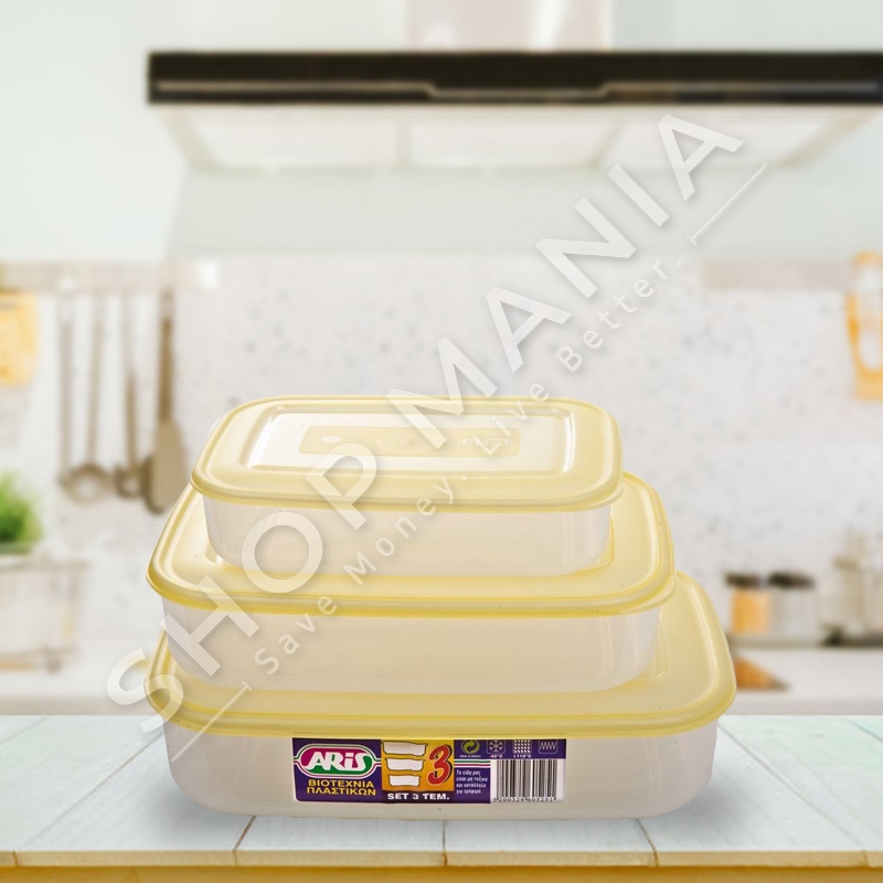 Set me 3 tasa drejtkendore per ruajtjen e ushqimit.