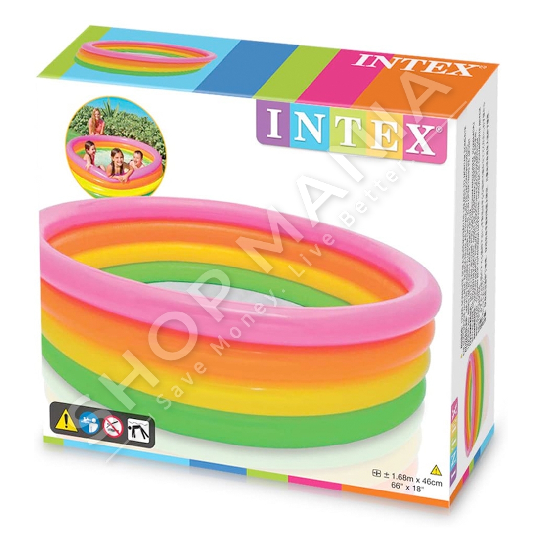 Nje pishine qe fryhet lehtesisht me ngjyra ylberi "Intex Sunset Glow Swimming Pool 56441NP" ofron argetim maksimal per femijen te levize dhe te luaje ne uje.