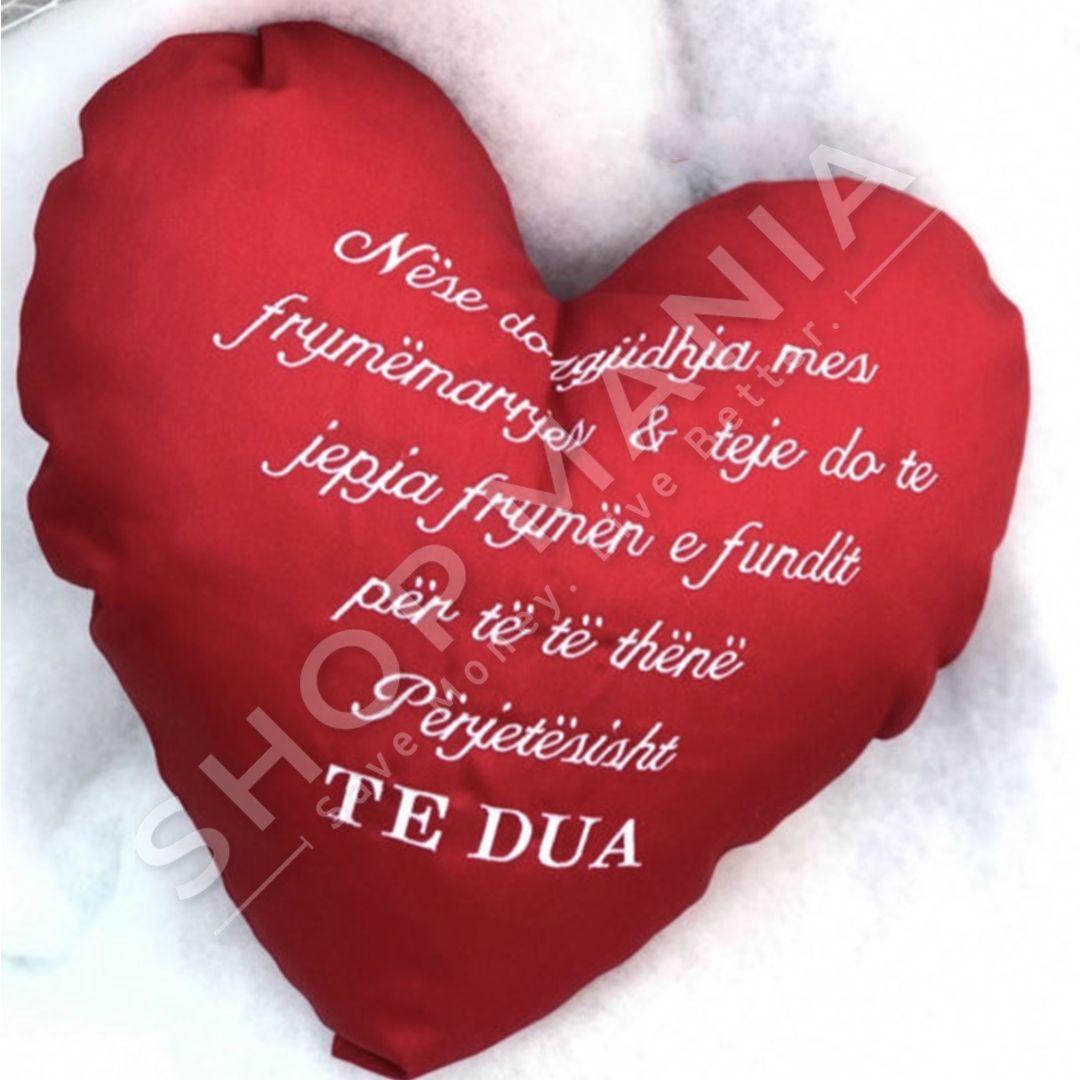 Jastek ne forme zemre ne ngjyre te kuqe me mesazh te qendisur sipas deshires. Materiali i lidhjes dhe qendisja behet me makine. Nje shembull mesazhi mund te jete: "Nese do zgjidhja mes frymemarrjes & teje do te jepja frymen e fundit per te te thene Perjetesisht - TE DUA"