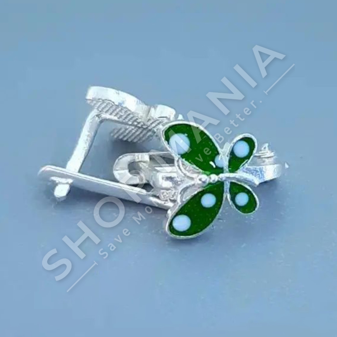 Karfice argjendi per veshje me dizajn fluture ne ngjyre jeshile.