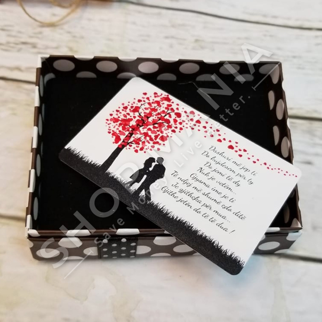 Kartoline dashurie, nje ide e vecante per Shen Valentin. Vjen ne formatin e nje karte krediti, te cilen mund ta mbani gjithmone me vete. Ne te mund te shkruani dedikime te ndryshme te personalizuara. Koha e realizimit te kesaj kartoline eshte 48 ore.