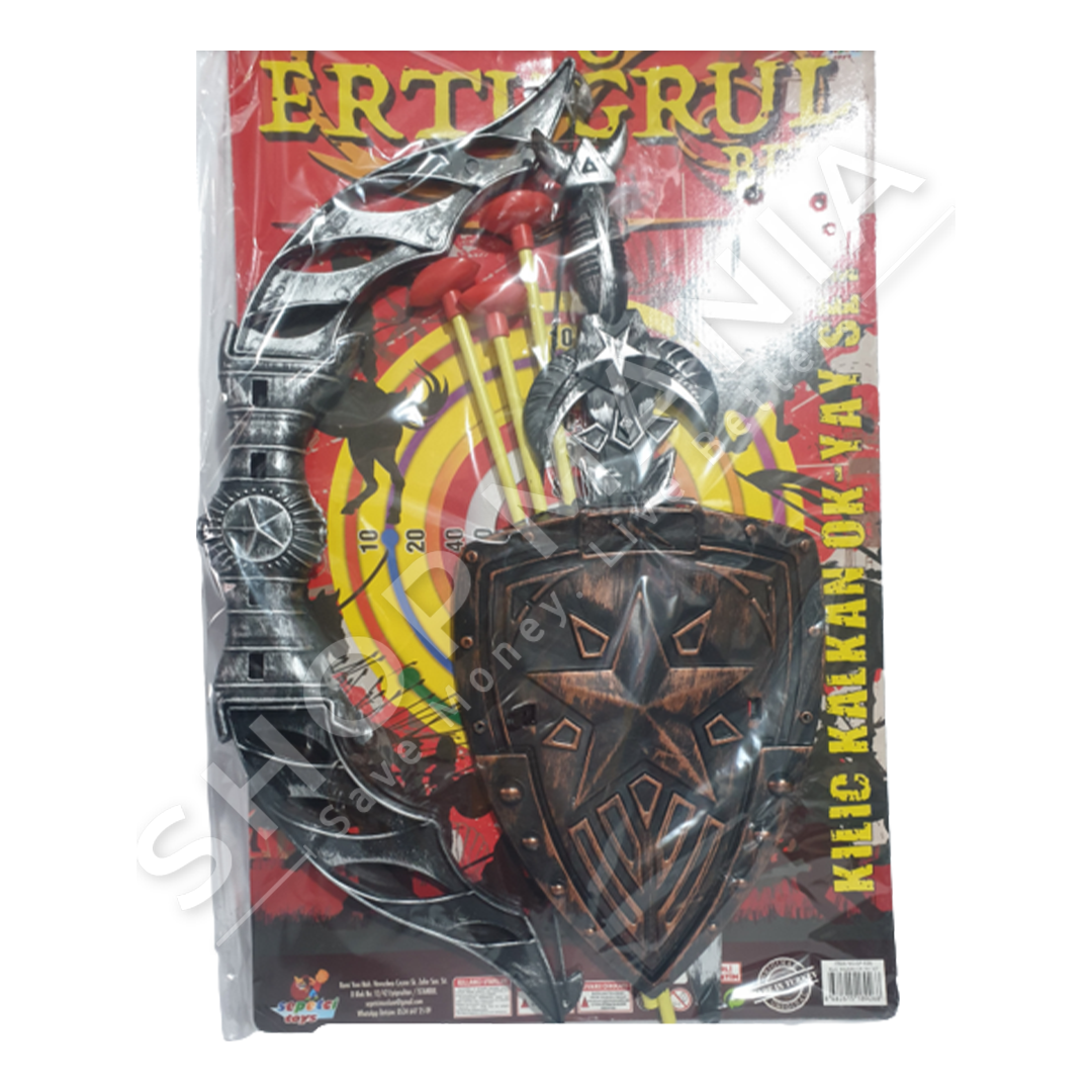 Seti permban nje hark shigjete, 3 shigjeta, shpate dhe nje mburoje.