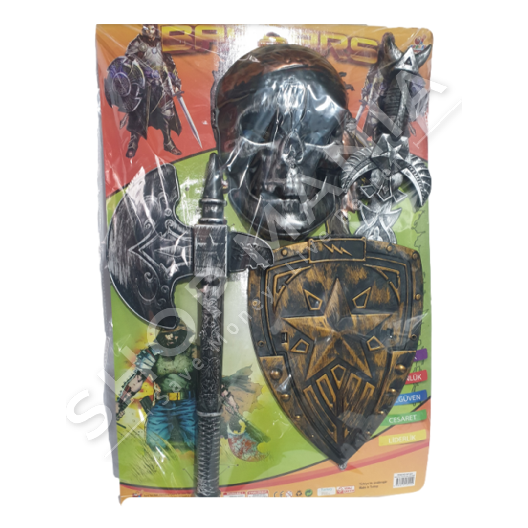 Seti permban nje mburoje, maske ne forme kafke, sepate dhe shpate.