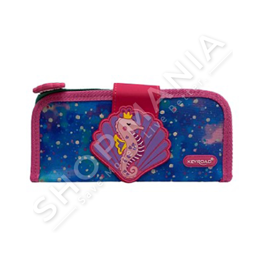 Portofol shkolle me dizajn te nje kali deti ne ngjyra blu dhe roze.