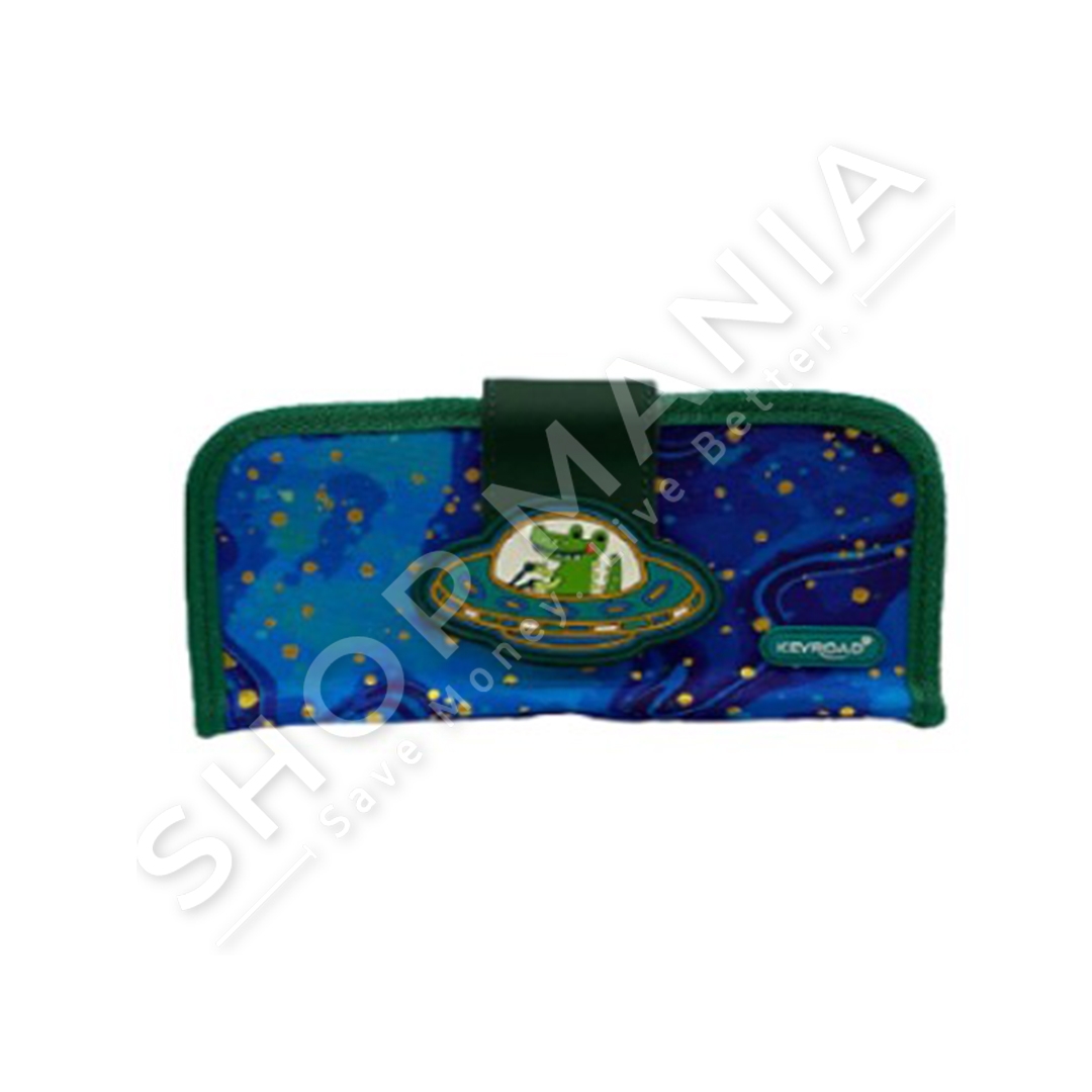 Portofol shkolle me dizajn te nje krokodili ne ngjyra blu, bojeqielli dhe jeshile.