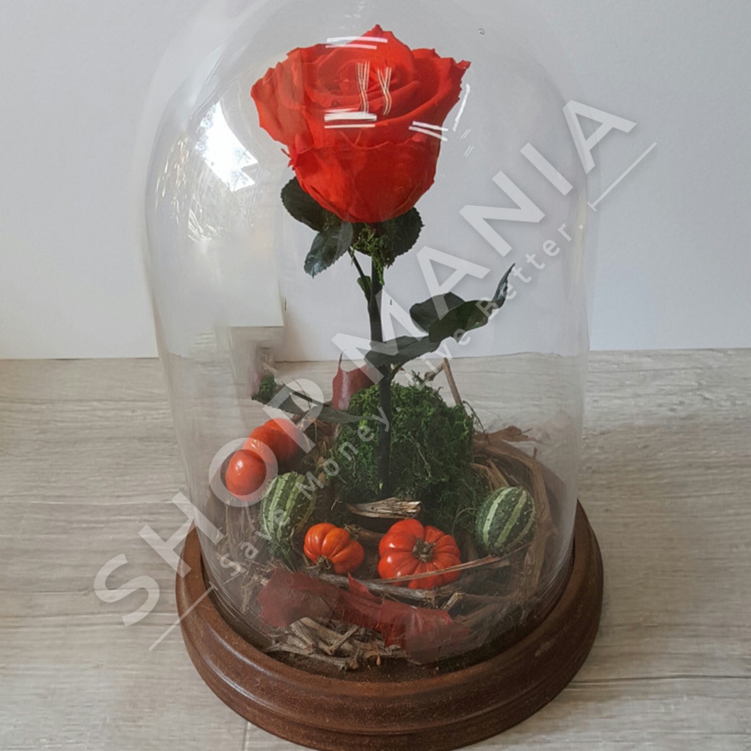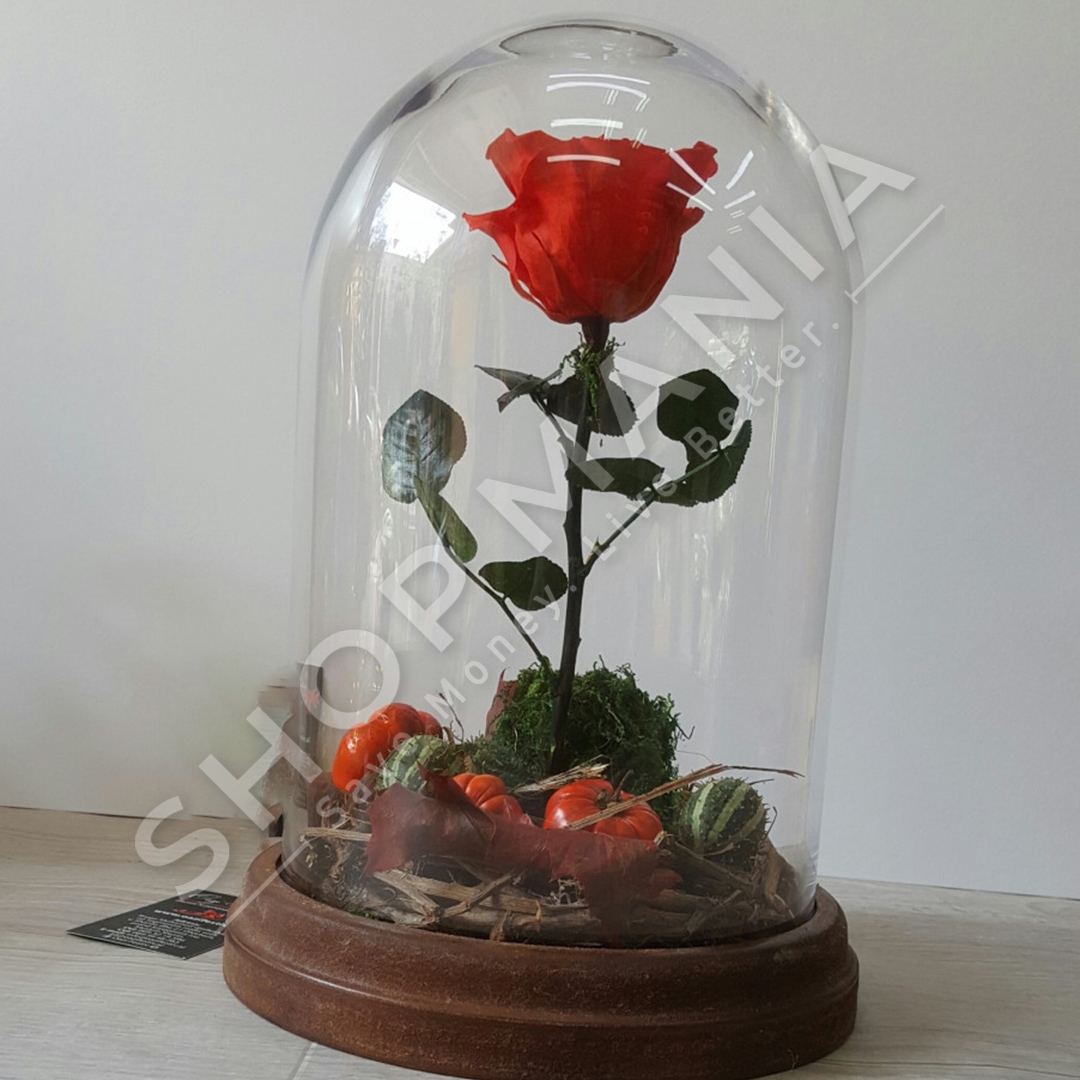 Kompozim "Beauty and the Beast" permban nje trendafil te balsamosur ngjyre te kuq dhe elemente dekorative te vendosura mbi nje baze druri me kupole xhami. Brenda saj mund te vendosni cfaredo lloj dedikimi qe doni, per ta bere te ndihet me special personin e zemres.