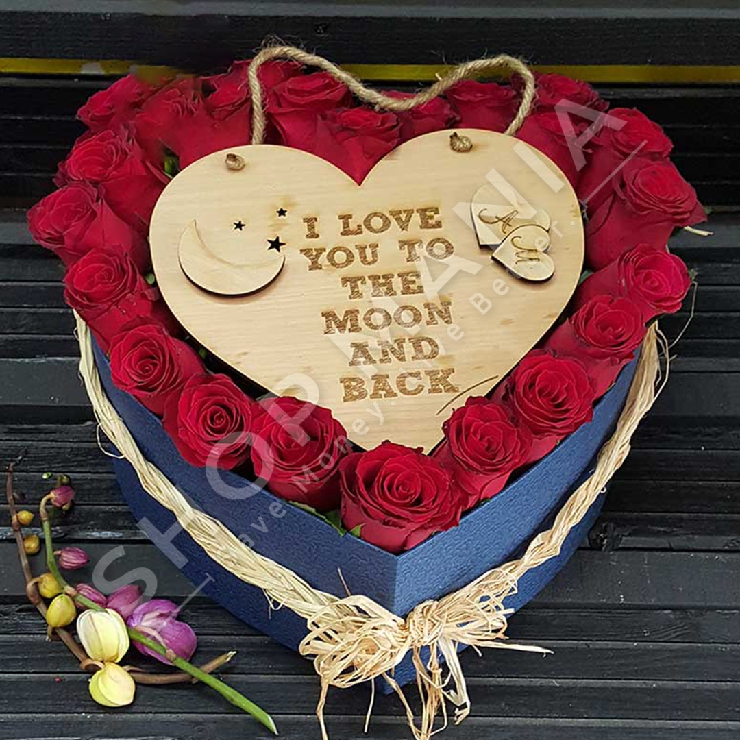 Kompozim lulesh "Full of Love" permban trendafila ne nje kuti ne forme zemre ngjyre blu. Brenda saj ka nje dru te gdhendur ne forme zemre me mesazh te personalizuar shoqeruar ne kuti ne forme zemre qe perfshin 20 trendafila te kuq. Zemra prej druri me aplikim 3D, eshte nje dhurate e personalizuar punuar ne nje fije druri.