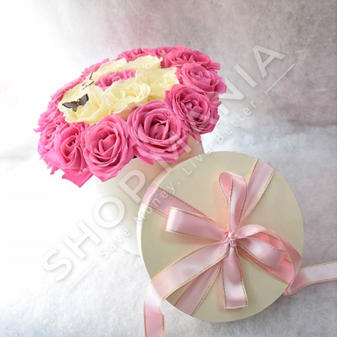 Kompozim ne kuti me 18 trendafila ngjyre roze dhe te verdhe.