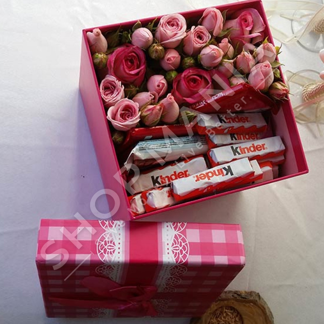 Kompozim ne kuti me trendafila ngjyre roze dhe cokollata.