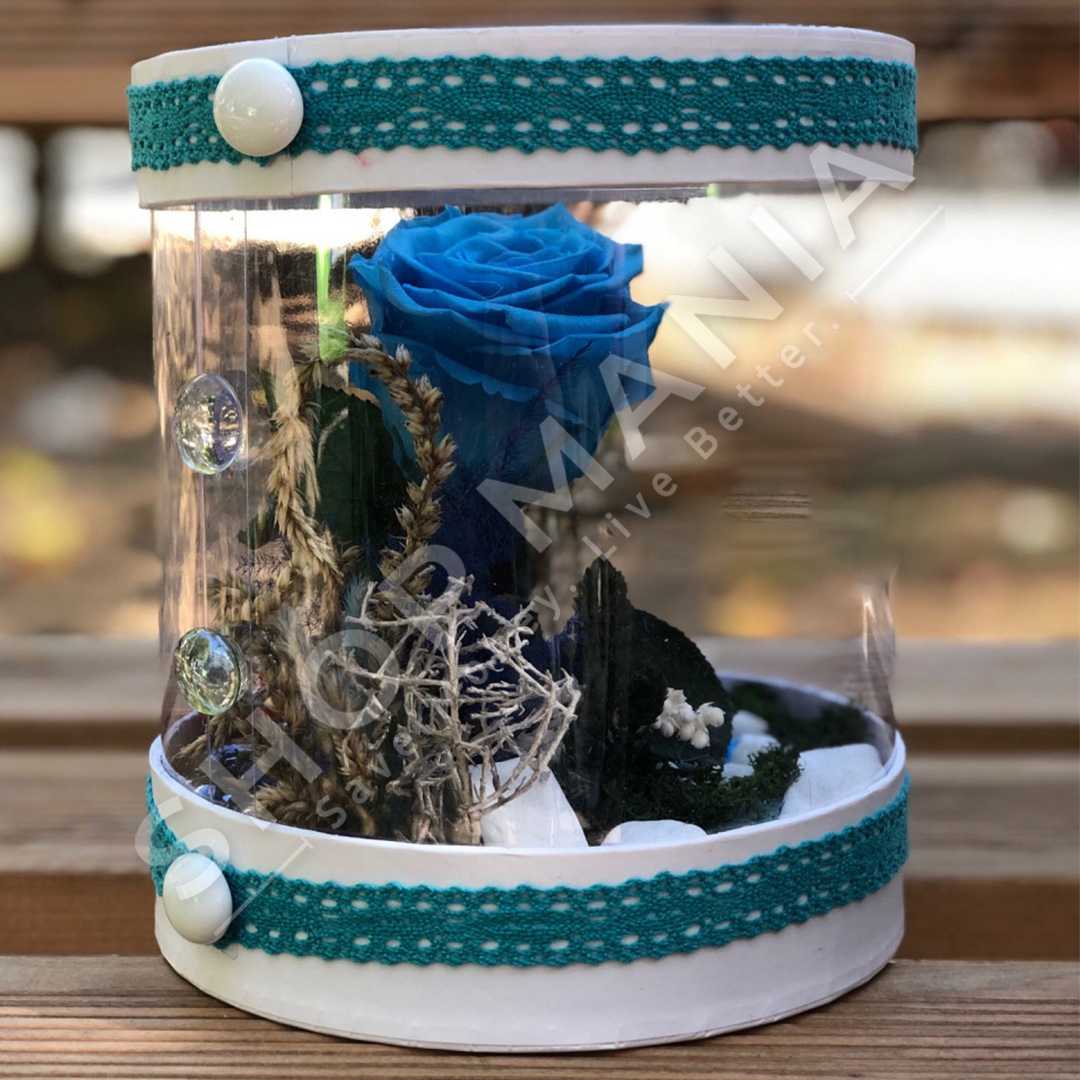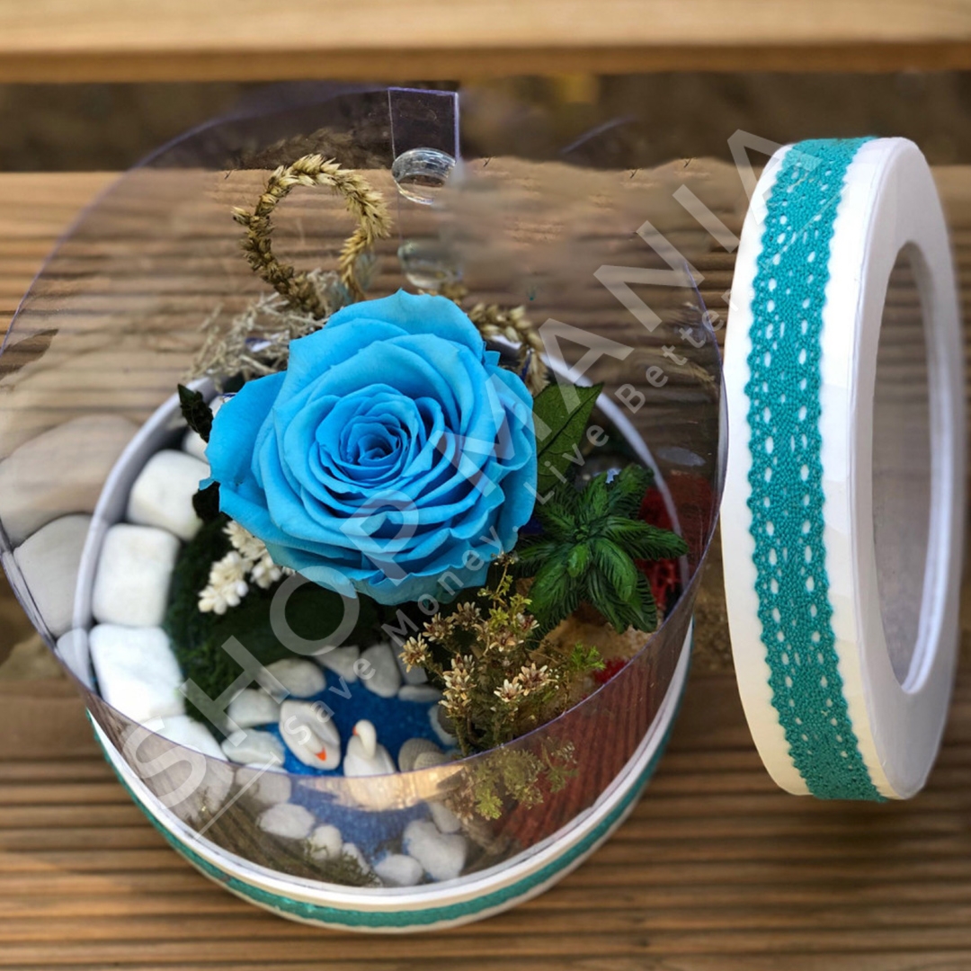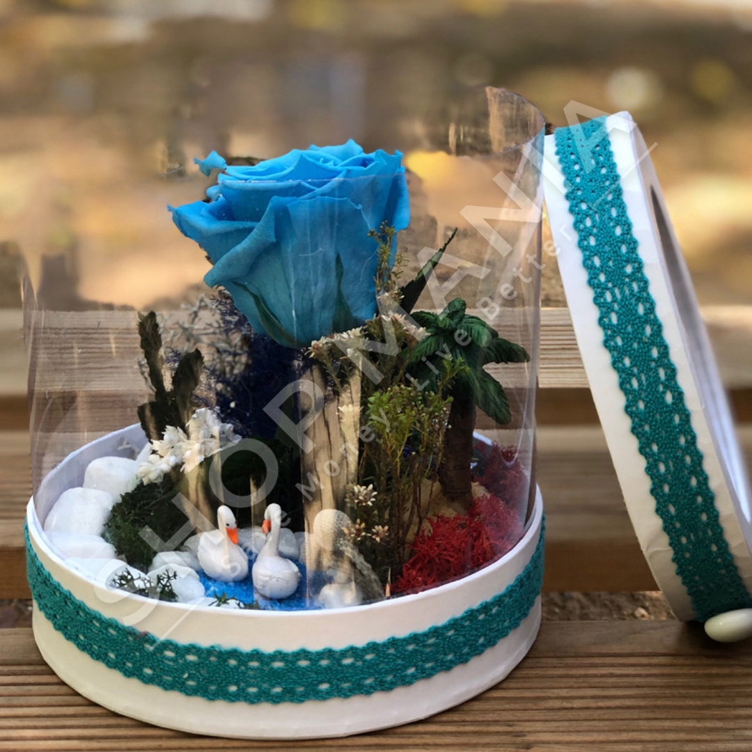 Kompozim "Swans and blu magic" e perbere nga nje trendafil ngjyre bojeqielli dhe mjelma.