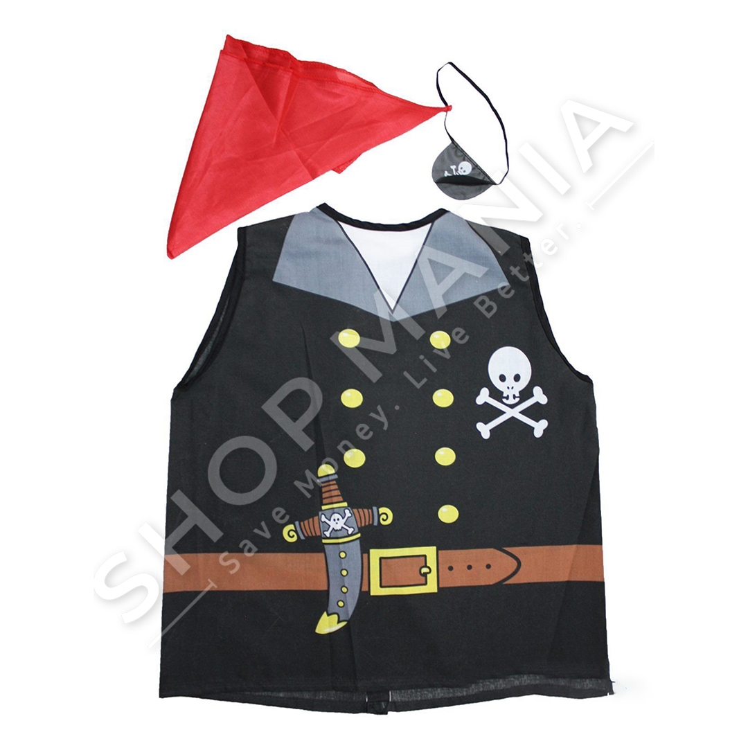 Përshkrimi:Kostum Halloween-i me pirate per femije te moshes 4-13 vjec.Kostumi perbehet nga nje jelek me dizajn pirati, shamia e piratit dhe syri i piratit.Mosha: 4-13 vjec