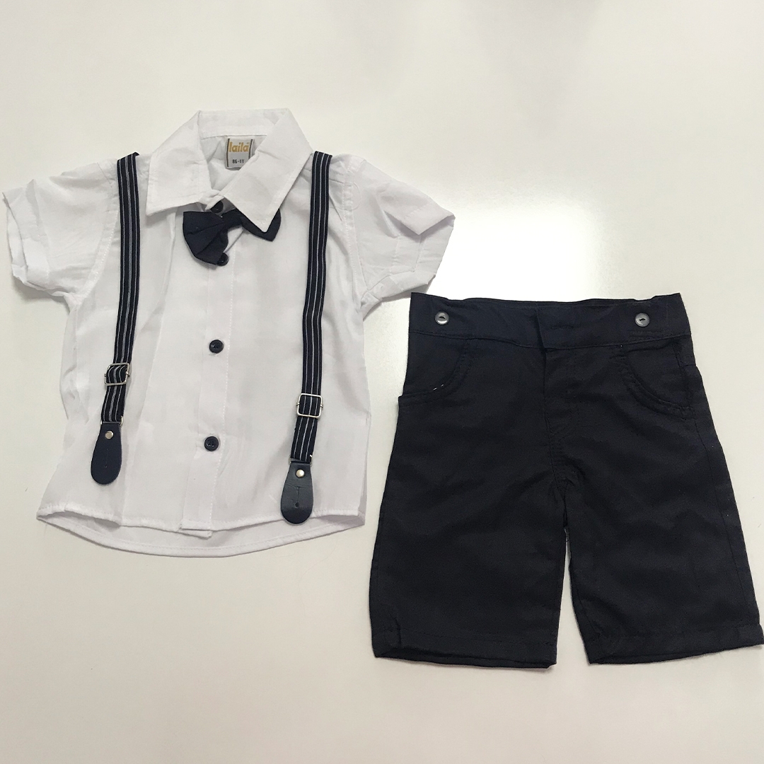 Kostum me kemishe me menge te shkurtra me papijon dhe pantollona trecerekshe.