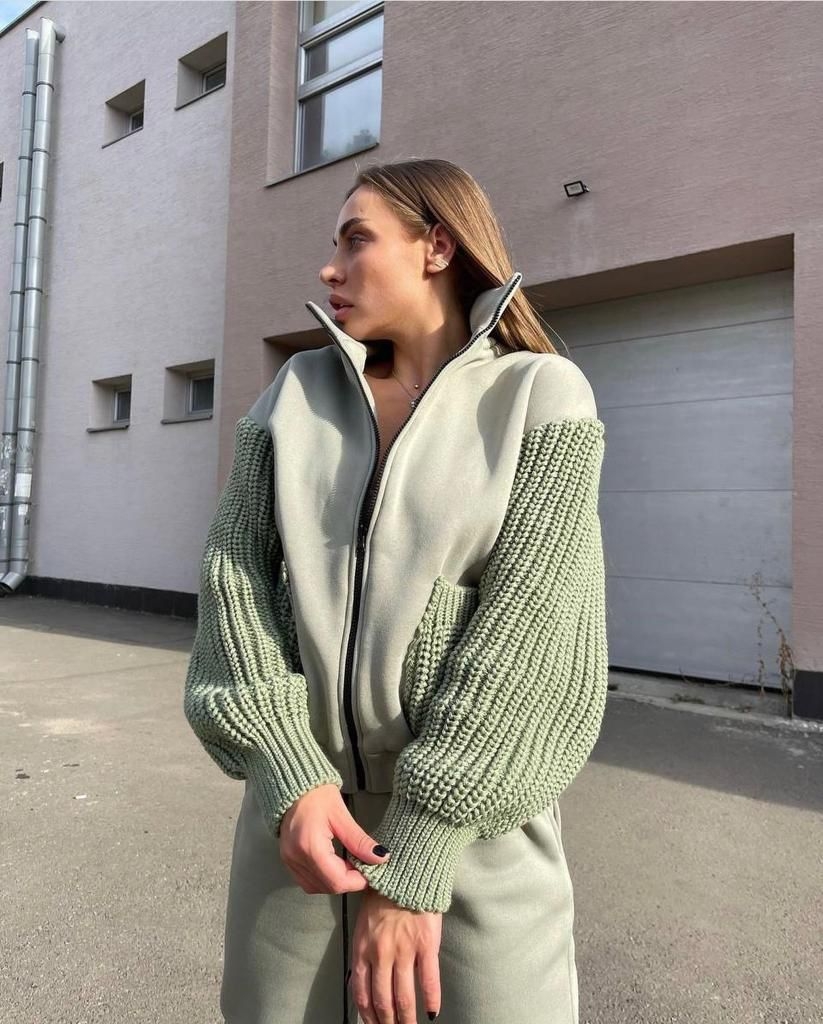 Bluza mbyllet me zinxhire dhe ka detajin e mengeve teper te vecanta.