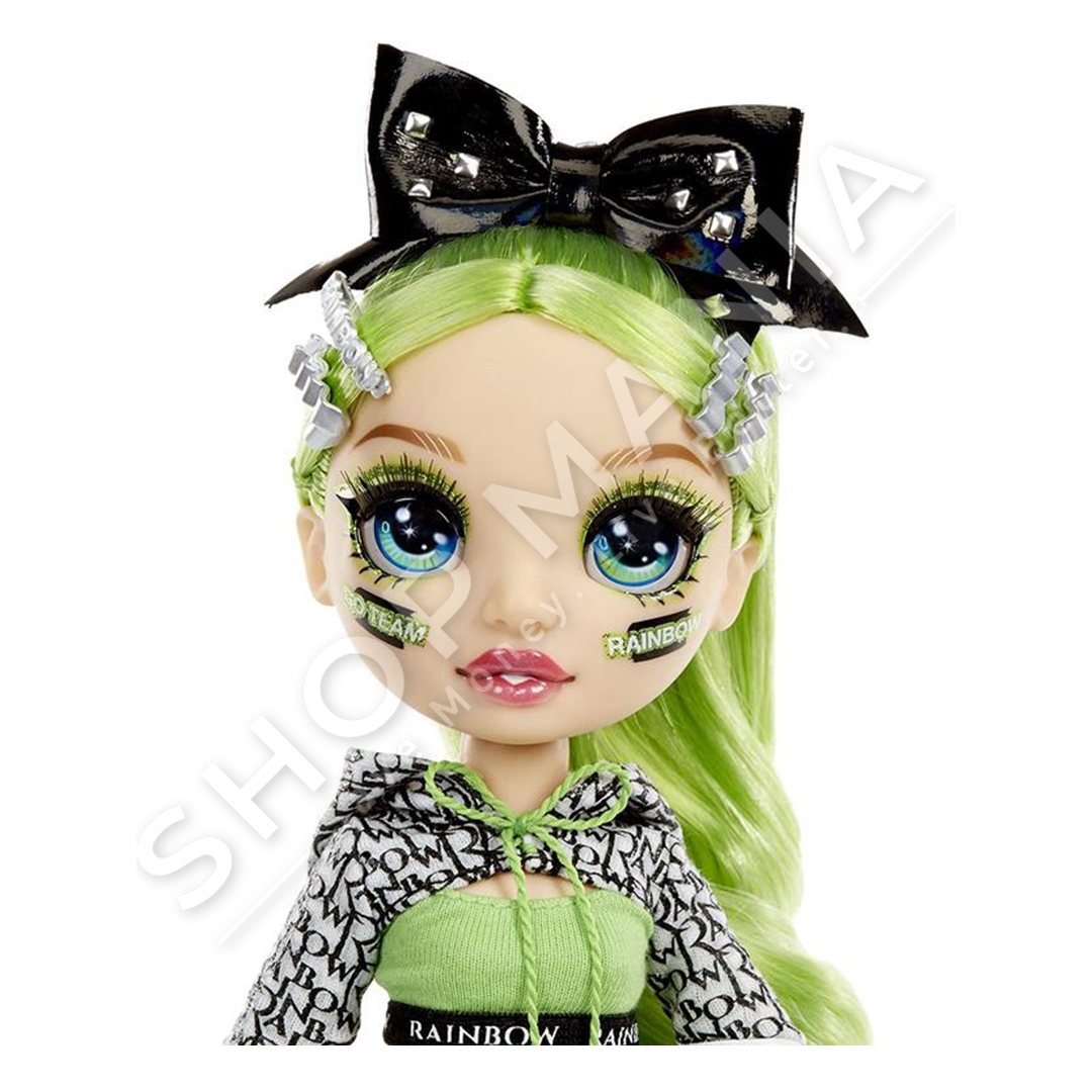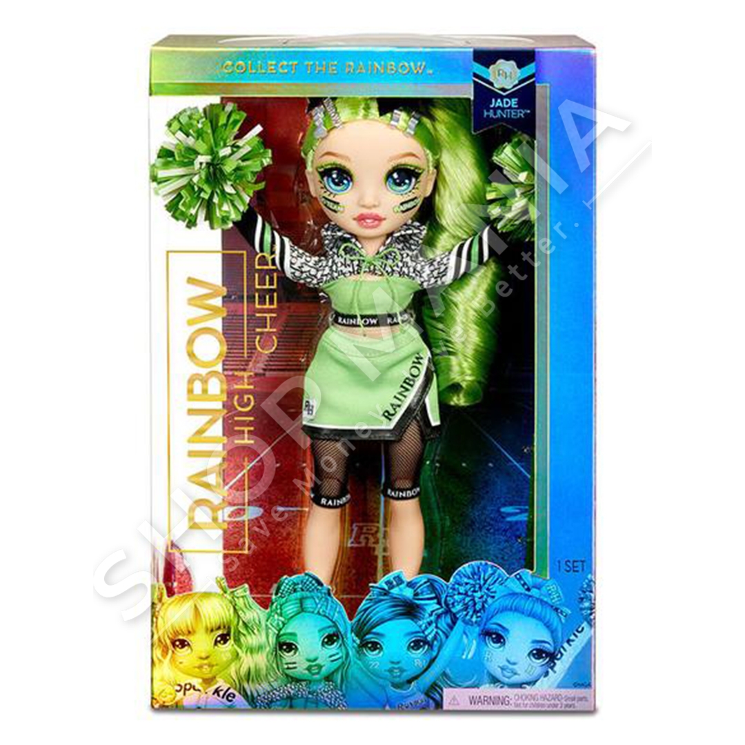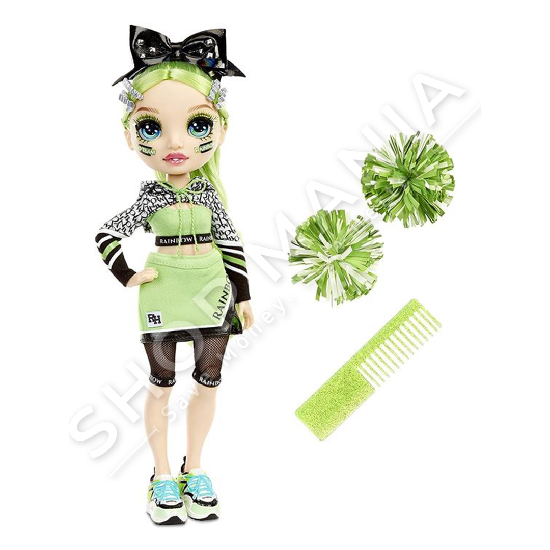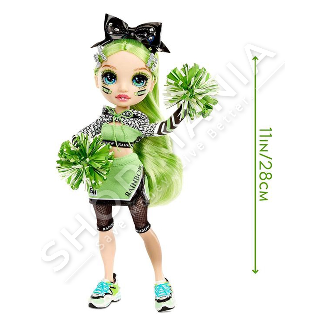 Kukulla Rainbow High Cheer Green Jade Hunter me tipare te mrekullueshme, qerpike te gjate dhe floke te bukur, te krehur ne nje bisht. Me kembe dhe krahe qe perkulen dhe vjen se bashku me kreher flokesh. Me nje veshje dhe floke ngjyre te gjelber dhe gjithashtu me pom poms per te brohoritur sa me shume. Mosha: +6 vjec