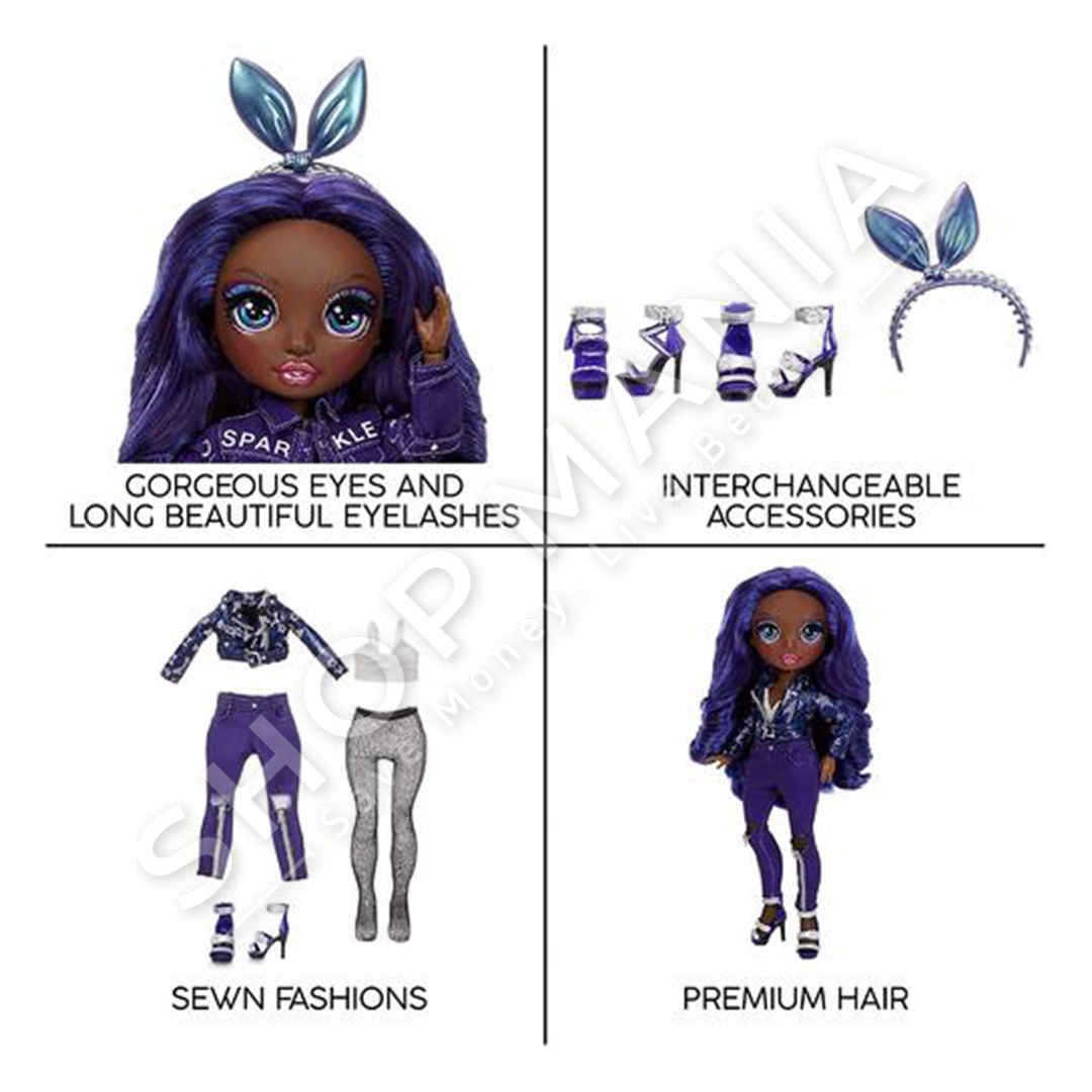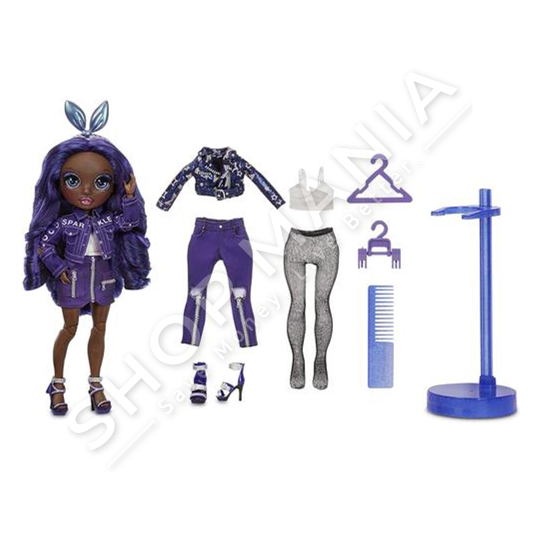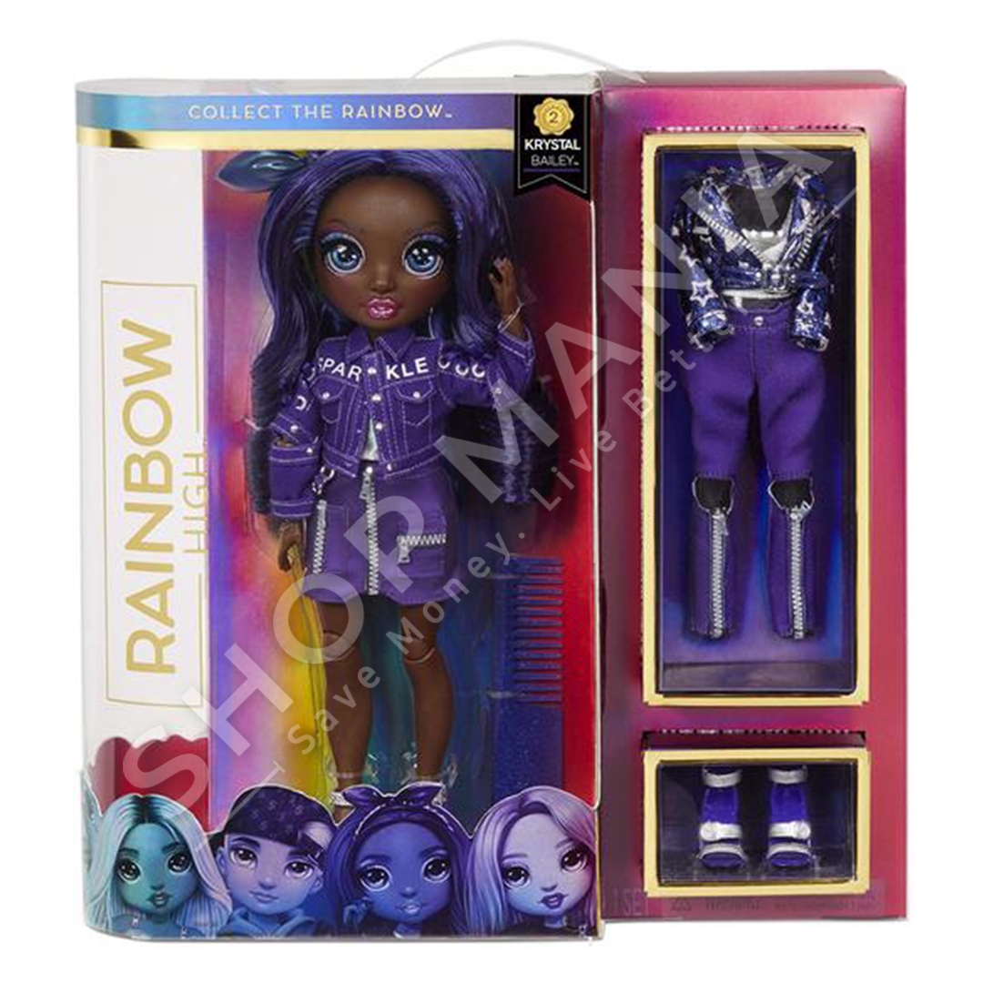 Kukulla Rainbow High Fashion Crystal Bailey e veshur me ngjyre vjollce dhe blu nga koka te kembet. Ka tipare te mrekullueshme, qerpike te gjate dhe floke te bukur e te krehur. Vjen me 2 veshje te plota kukullash dhe aksesore kukullash. Vjen me dy xhaketa te qepura, nje fund, xhinse, bluza dhe 2 pale taka. Mosha: +6 vjec