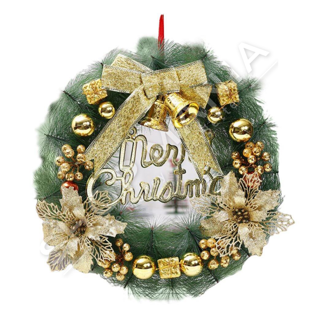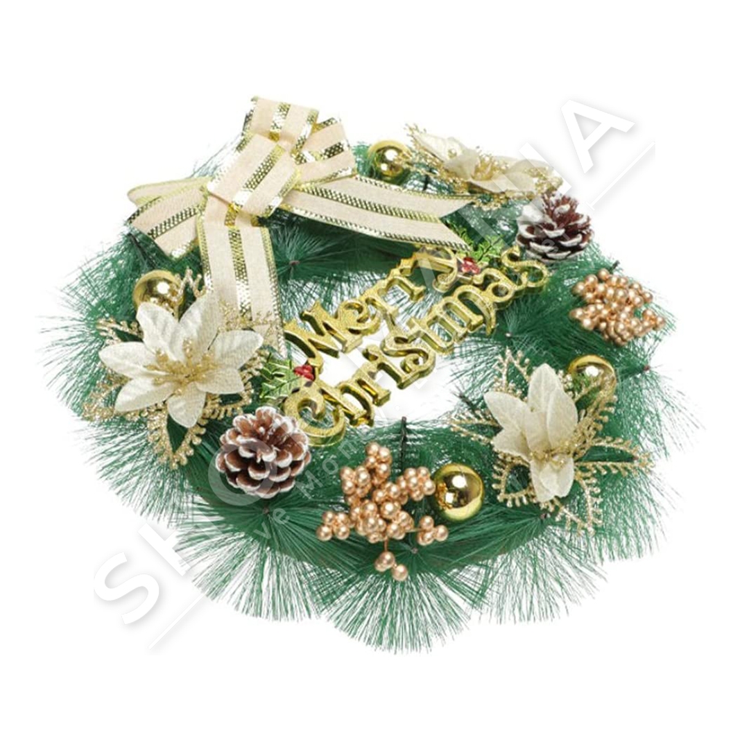 Përshkrimi:Kurorat dekoruese sherbejne si dekor fantastik per ambientet e shtepise.Me lule, fjongo dhe topa ne ngjyre gold.Me dizajn Merry Christmas.
