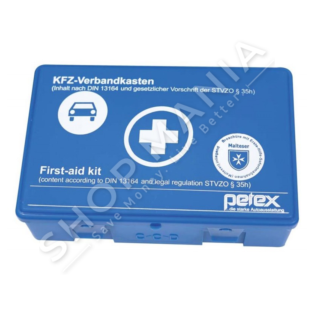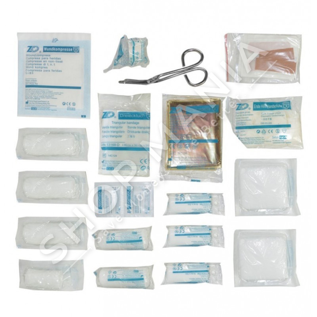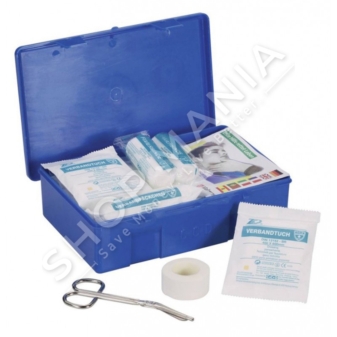 Kuti e ndihmes se shpejte ne ngjyre blu, eshte nje zgjidhje ideale per rastet emergjente te aksidenteve apo lendimeve te vogla. Kutia perfshin: doreza, shirit ngjites, batanije emergjente, fasho trekendesh, fasho elastike, pastrues per demtime te lekures, fasho per djegie, garza, garza standarte, kompresa per plage dhe 1 gershere.