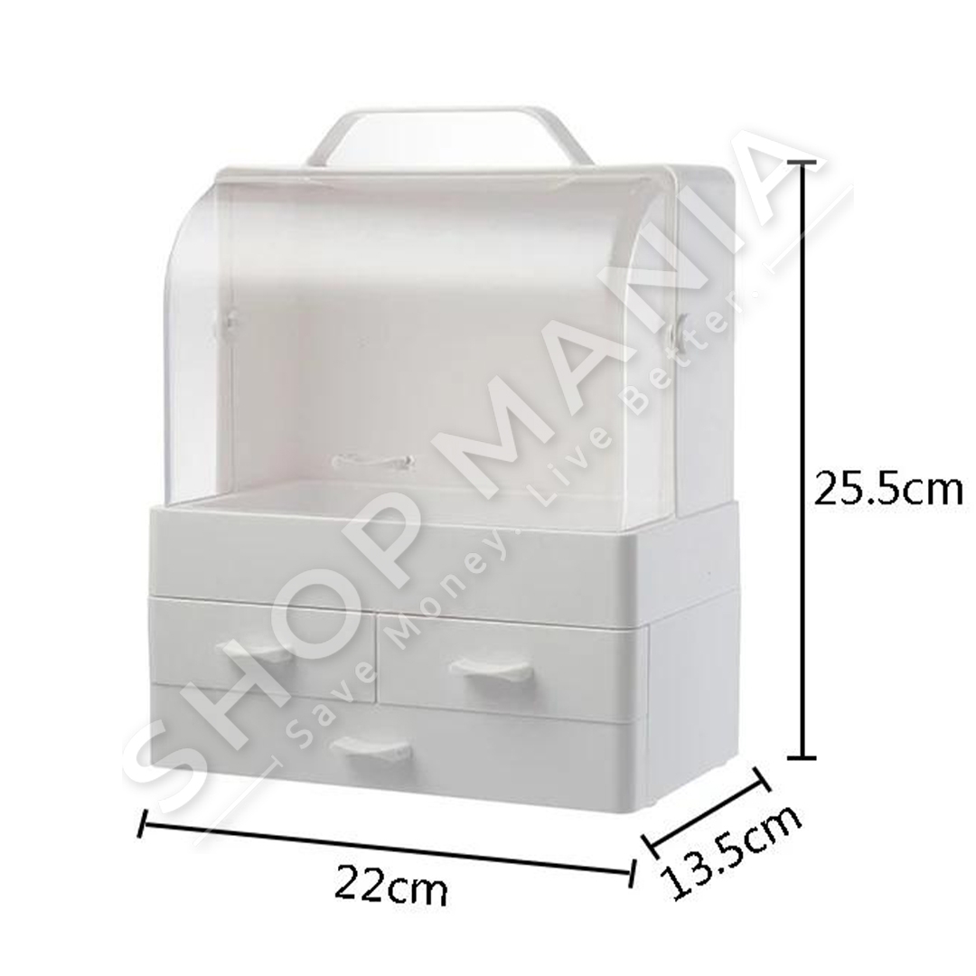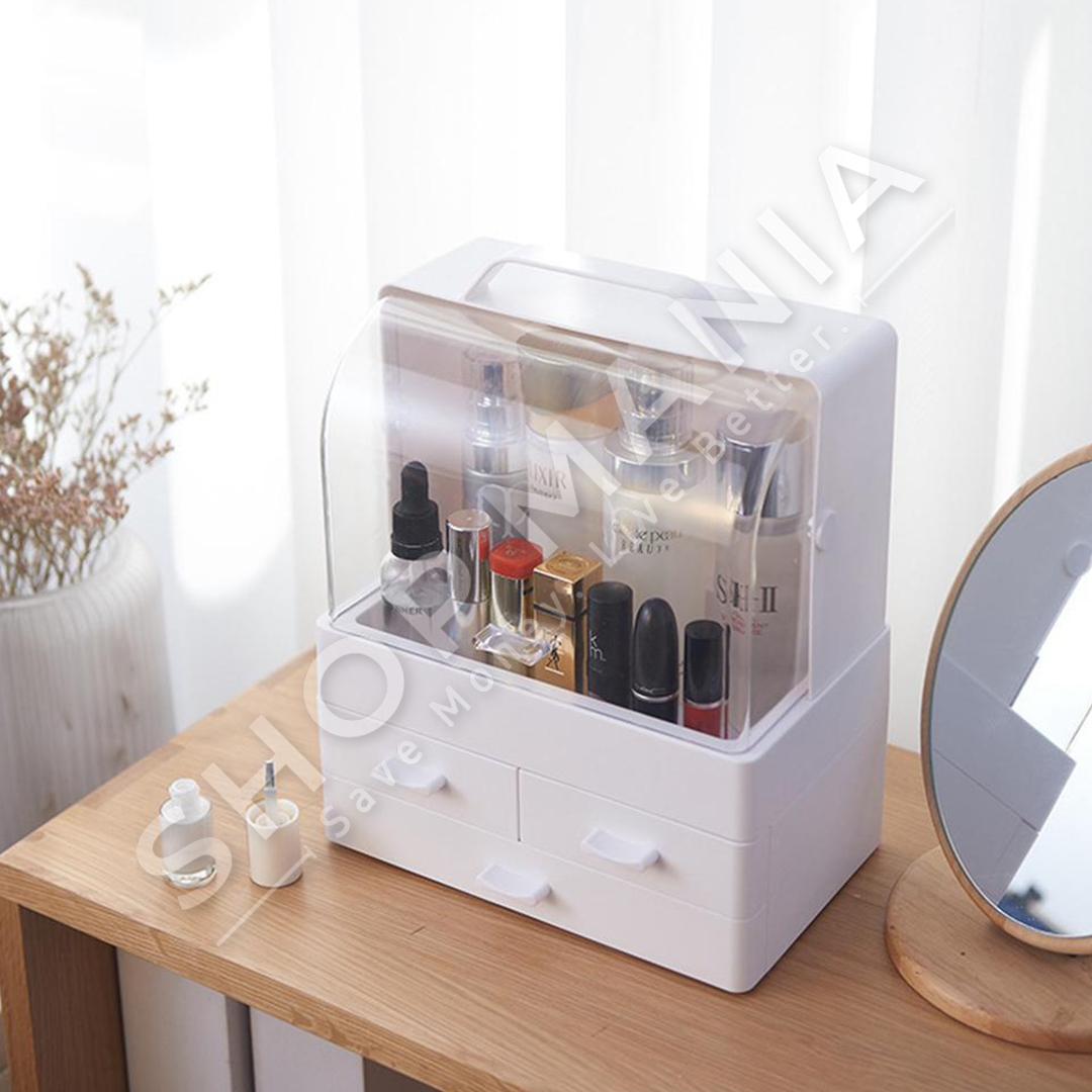 Kutia sistemuese e MAKE UP-it eshte nje zgjidhje perfekte per vendosjen e produkteve te MAKE UP-it. Kutia permban 4 sirtare nga te cilet 2 sirtare jane te medhenj dhe 2 te vegjel. Permban 16 ndarje kryesore per te sistemuar gjithe produktet tuaja kozmetike, bizhuterite, apo aksesore te ndryshem per floket. Mund te mbahet ne shumicen e dollapeve, tavolinave pasi eshte e vogel dhe praktike. Mund te mbaje te pakten 15 furca makeupi, 10 buzekuq, 8 manikyre per thonjte, 8 lapsa per syte, 3 paleta te medha dhe te vogla per syte. Me kete kuti sistemuese ju ulni rremujat dhe fitoni hapesire.