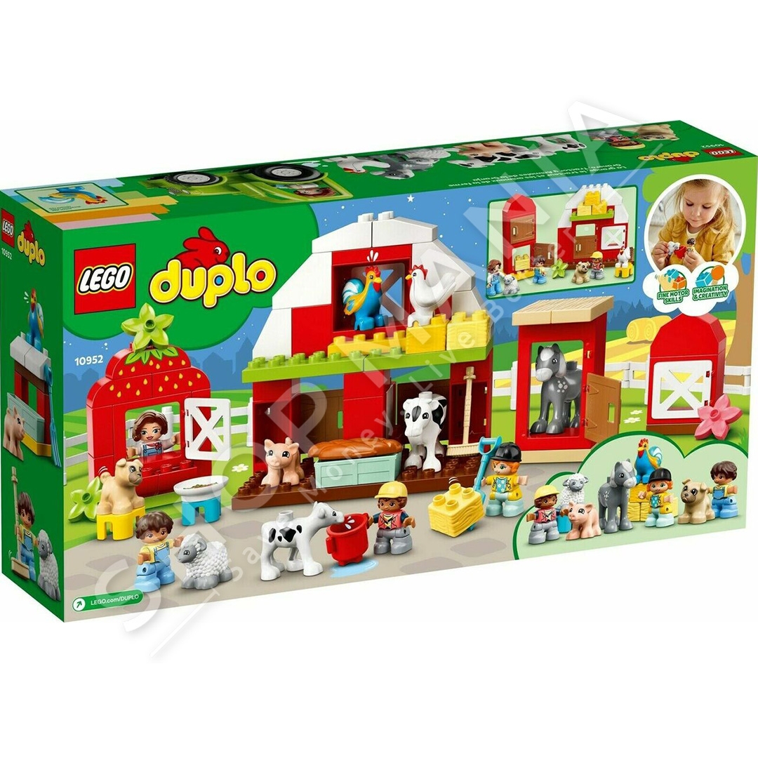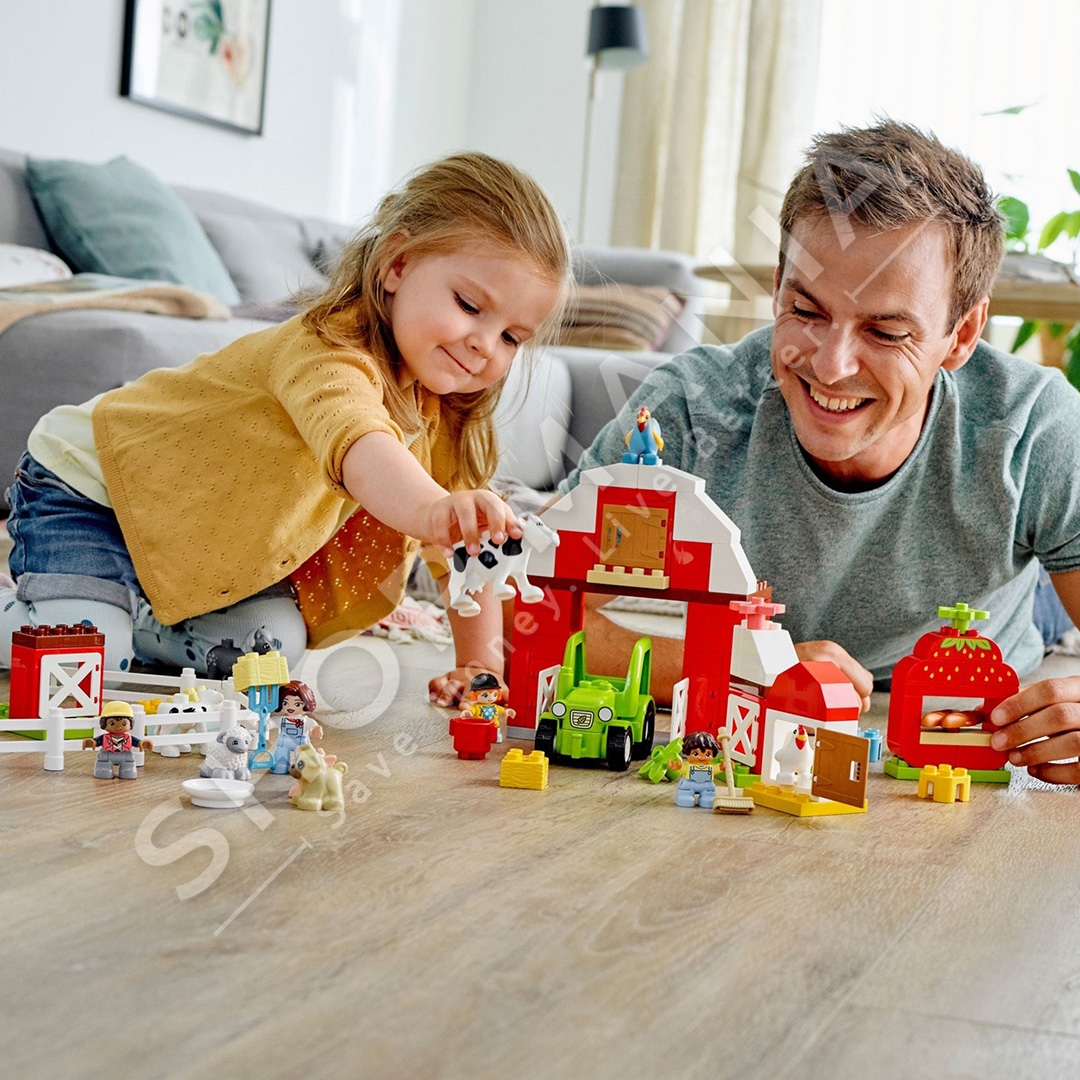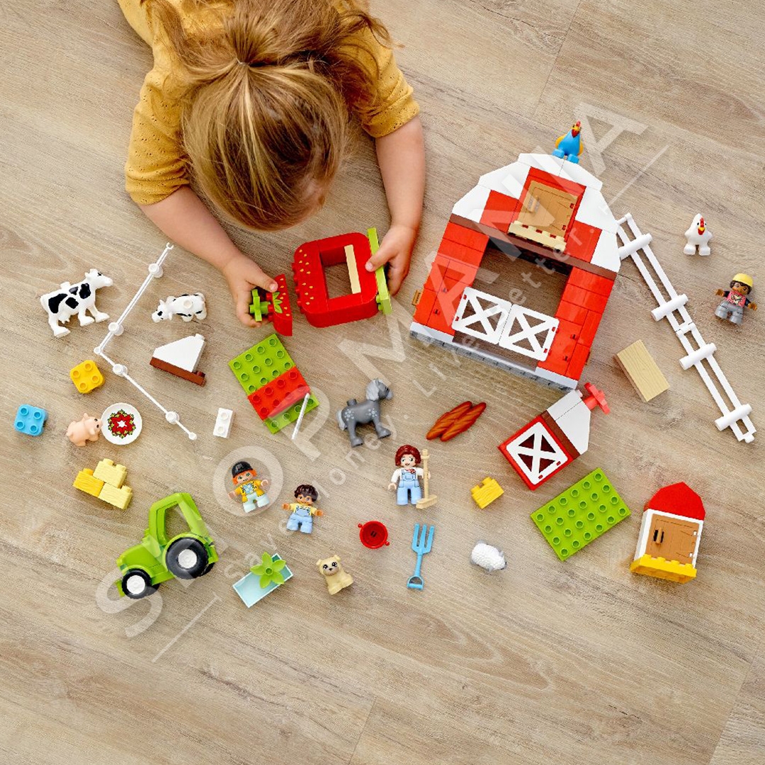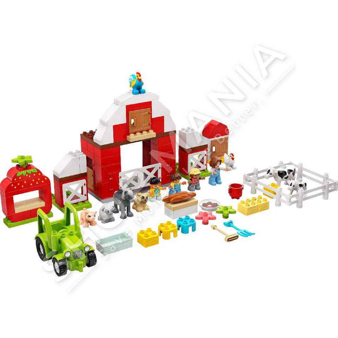 Lego Duplo Barn, Tractor & Farm Animal Care eshte ndertuese Lego per femijet mbi 2 vjec. Eshte nje mundesi e mire mesimi dhe argetimi per te vegjelit qe i duan kafshet dhe automjetet e fermes. Vogelueshi juaj do te kenaqet duke ushqyer kafshet, duke ngare traktori dhe duke hipur ne kale. Seti perfshin: nje traktor, derr, dele, kal, qen, pule, gjel, dy lope, nje hambar te ndertueshem, dhe pajisje shtese. Seti permban 97 pjese dhe eshte i lehte per t'u formuar. Mosha: +2 vjec