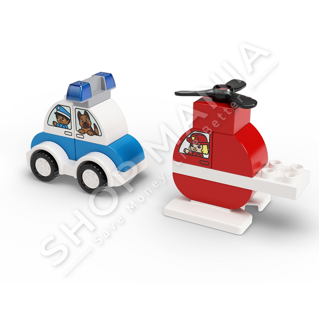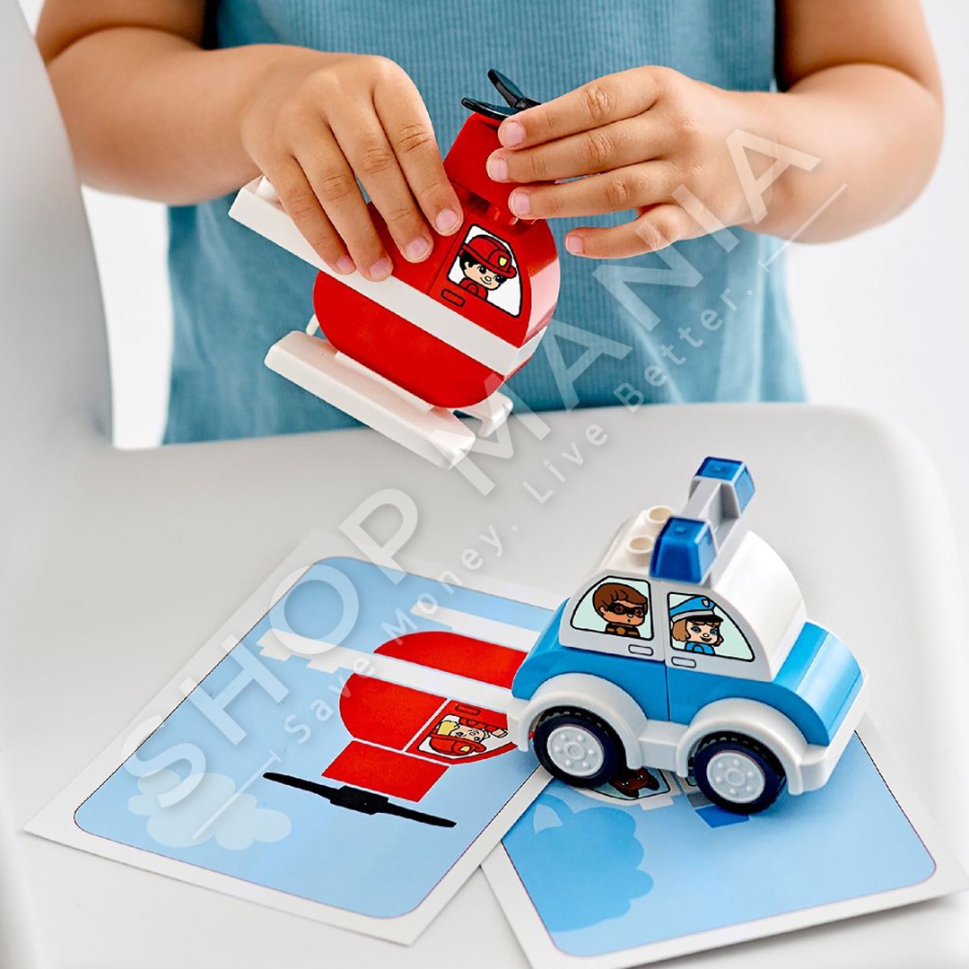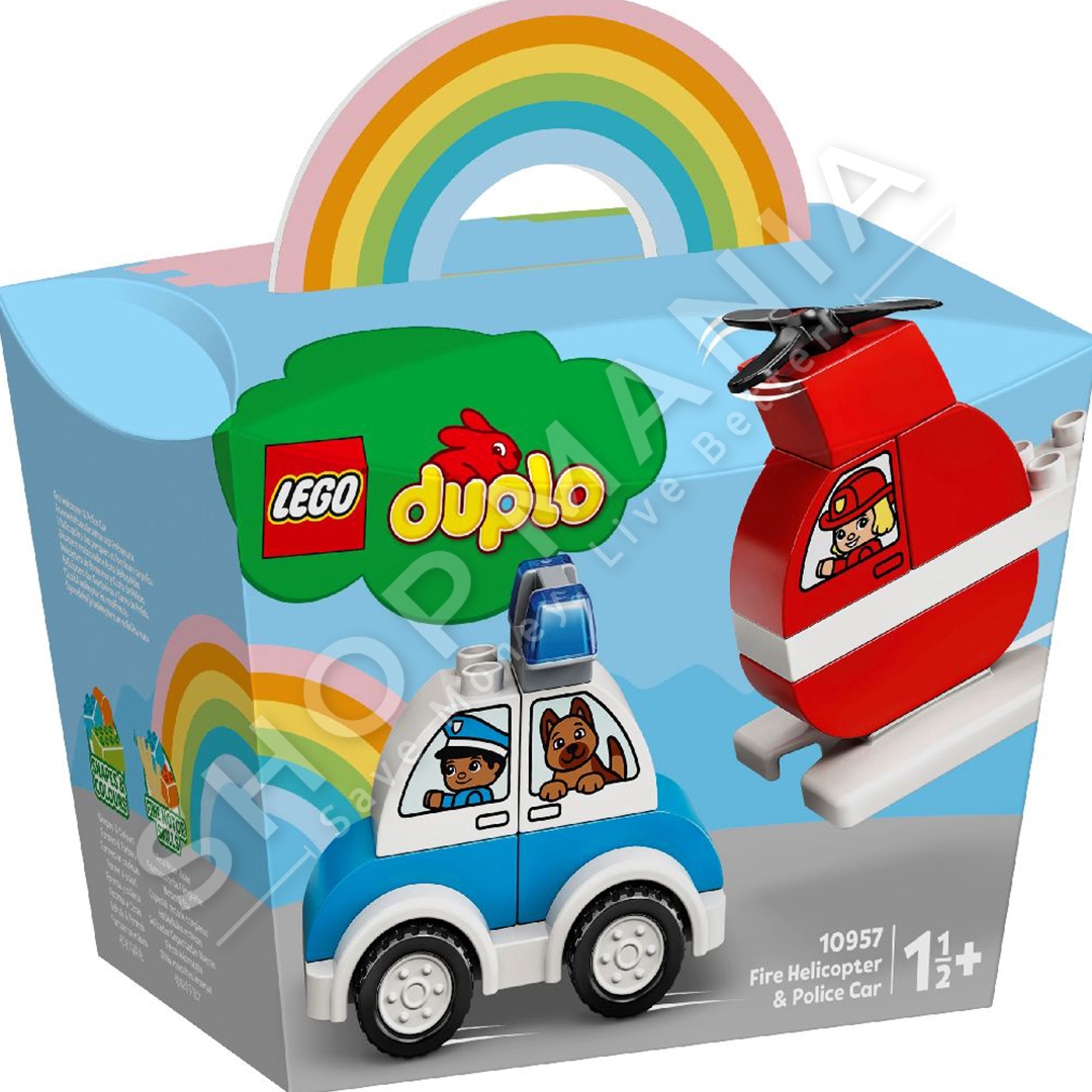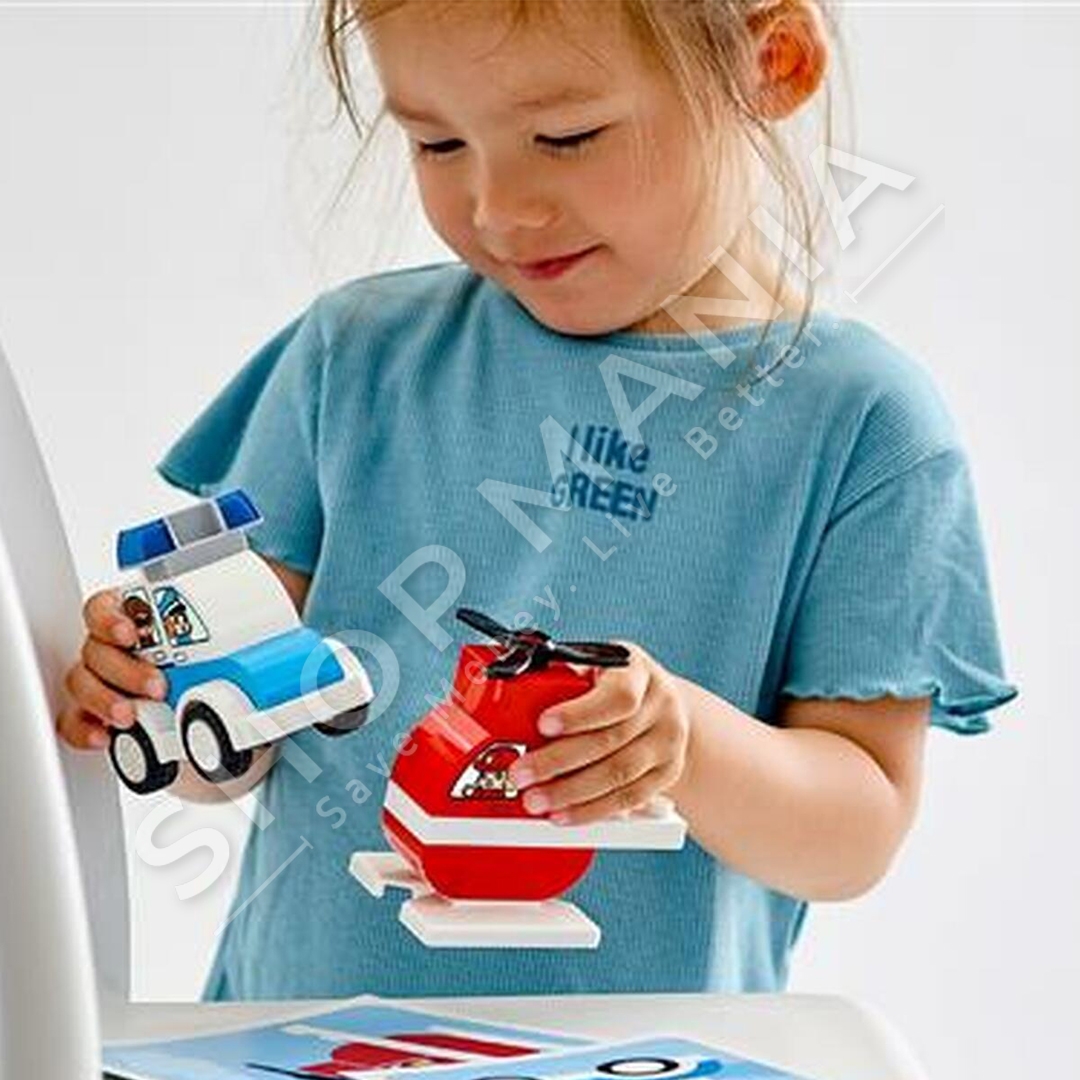 Lego Duplo Fire Helicopter & Police Car eshte ndertuese Lego qe zhvillon te femijet aftesite krijuese. 14 pjeset e saj sherbejne per te ndertuar nje helikopter qe fik zjarrin dhe nje makine policie. Eshte e pershtatshme per femijet mbi 1 vjec e gjysme. Mosha: +1 vjec e gjysme