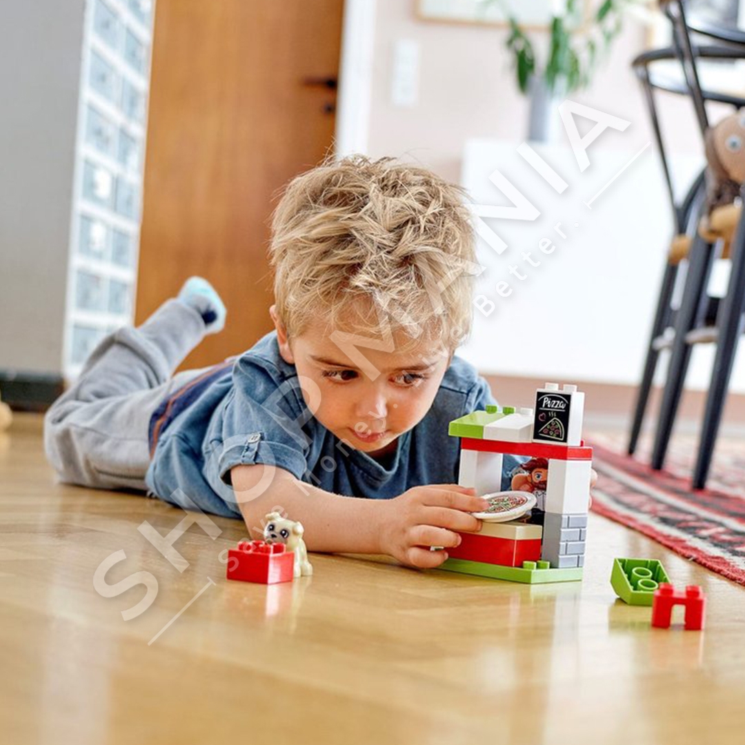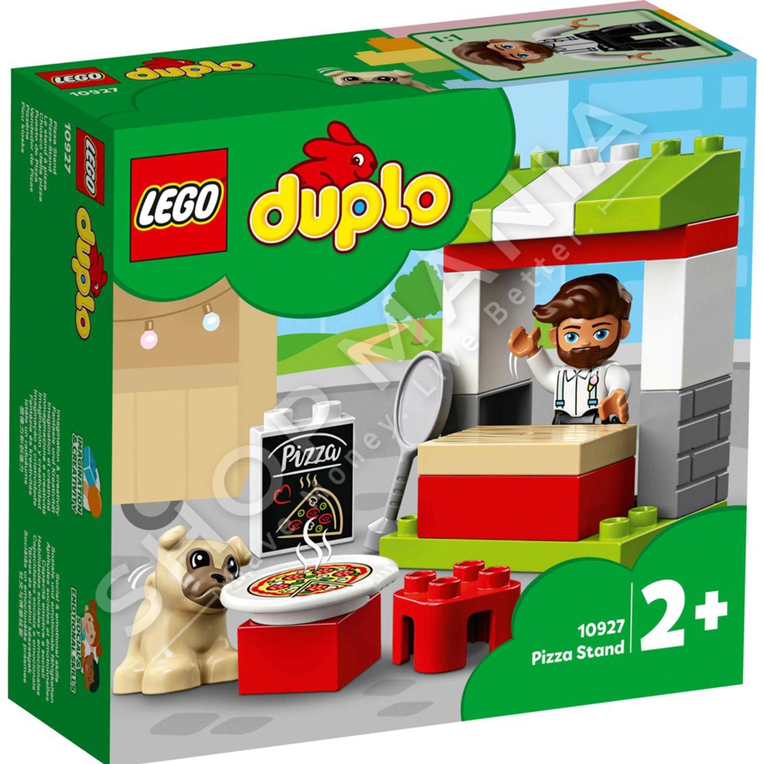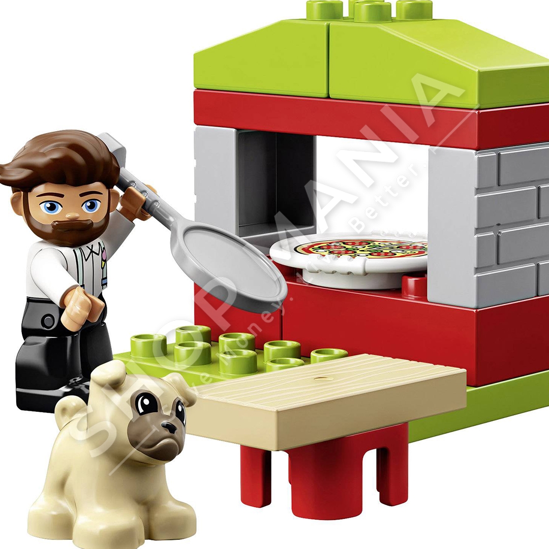 Lego Duplo Pizza Stand eshte ndertuese Lego me te cilen luajne femijet mbi 2 vjec. Me 18 pjeset e saj ju mund te ndertoni nje stende per berjen e picave dhe gjithashtu nje tavoline dhe karrige te vogel. Perfshihen ne set figura e kuzhinierit te picave, qeni dhe nje pice e vogel e shijshme. Mosha: +2 vjec