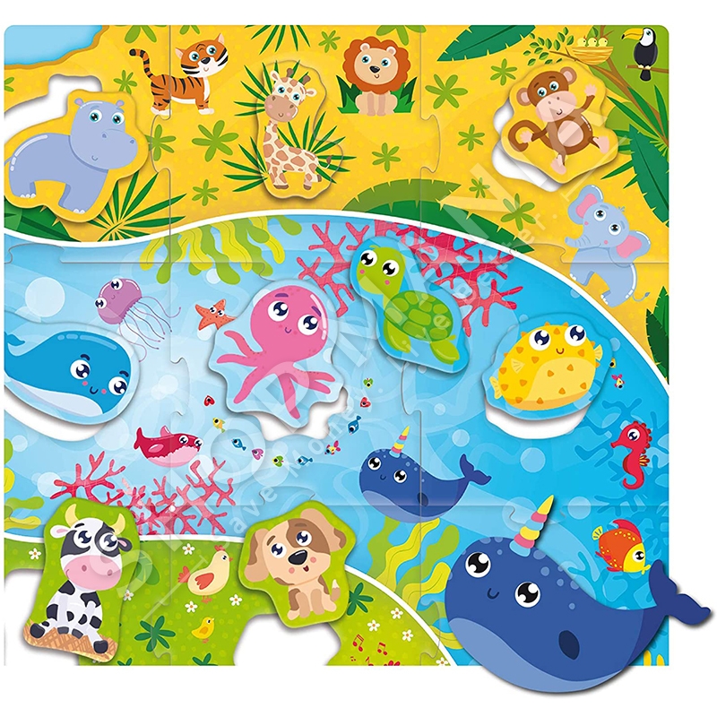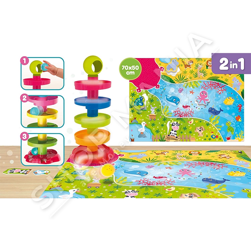 Seti perbehet nga nje kulle spirale plastike dhe nje top i vogel i cili pershkohet nga topi dhe gjithashtu nga puzzle me kafshe!