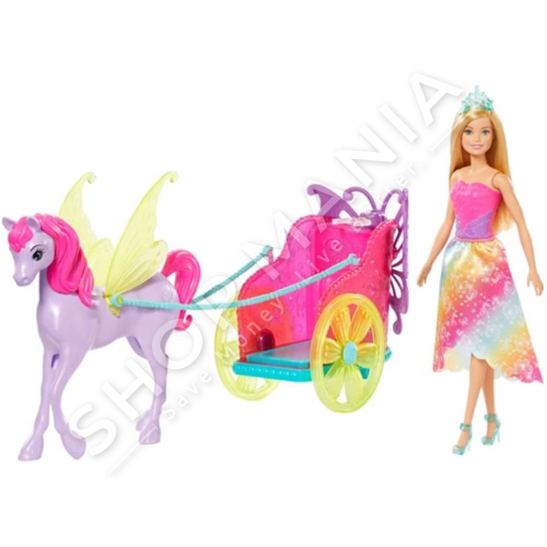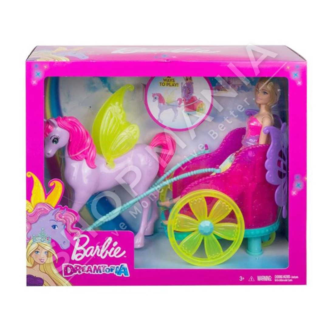 Kukulla Barbie Dreamtopia Fantasy Horse & Chariot se bashku me karrocen e saj dhe kalin me flatra. Fustani dhe karroca e saj jane te kombinueshme me njera-tjetren me ngjyra shume te bukura me shkelqim. Se bashku me kalin me floke dhe bisht roze dhe me flatra te verdha, eshte nje dhurate ideale per te vogelushet tuaja. Mosha: +3 vjec