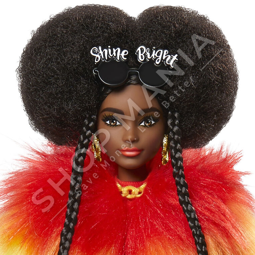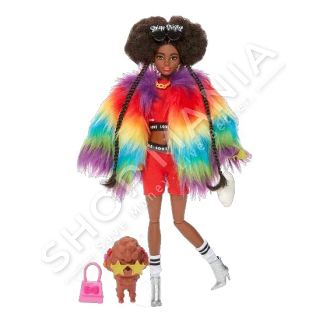 Kukulla Barbie Extra 1 Rainbow Coat me nje look modern me nje pallto shumengjyreshe si ylber.