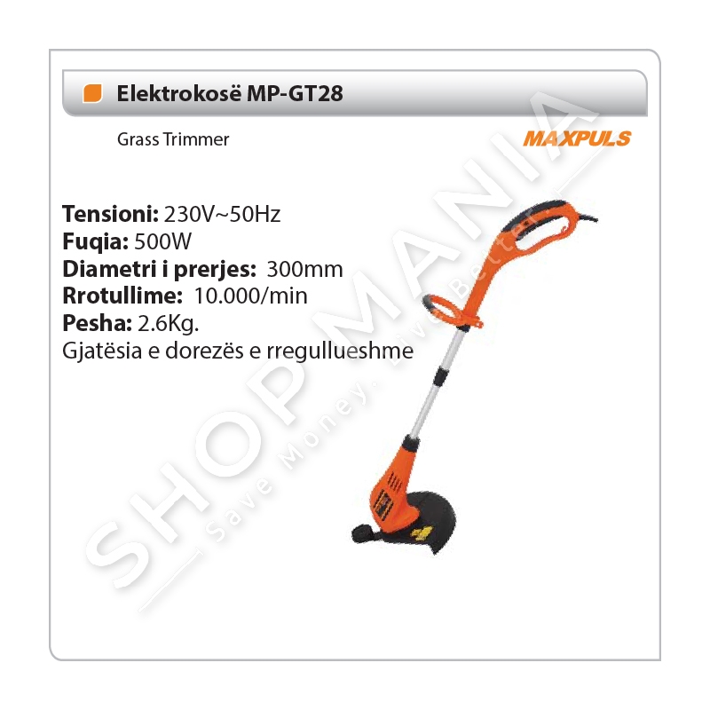 Elektrokose e markes MaxPuls me nje motor prej 260mm. Diametri i prerjes 300m. Peshon pak dhe eshte e pajisur me nje doreze gjatesia e se ciles eshte e rregullueshme.